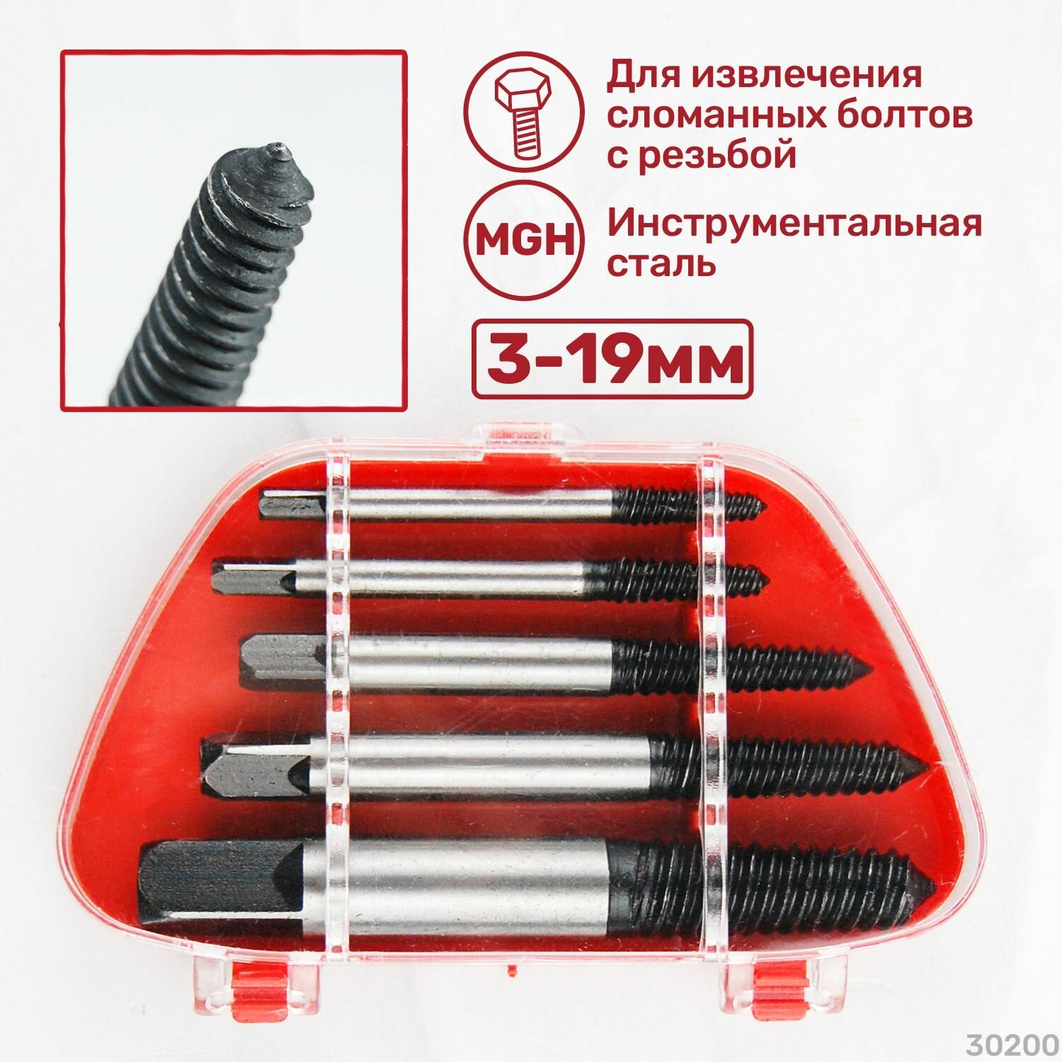 | Дополнительная информация | для извлечения повреждённых винтов и шпилек с правой резьбой диаметром от 3мм до 19мм |