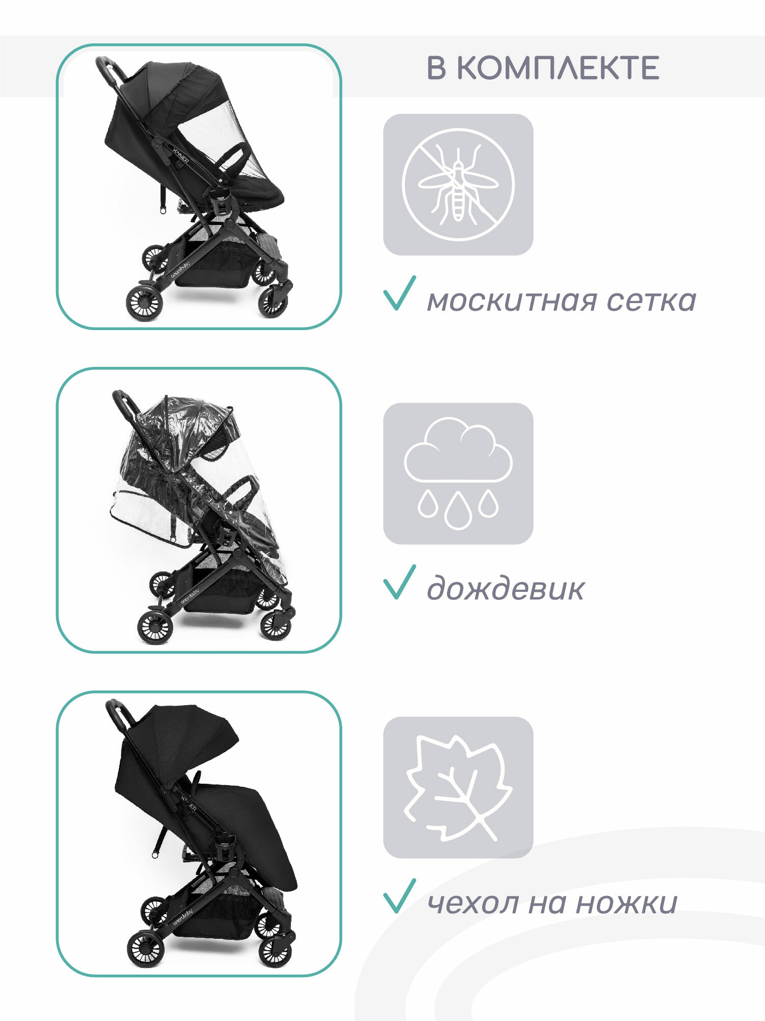 | Аксессуары в комплекте | антимоскитная сетка, дождевик, накидка на ноги, подстаканник, сумка для хранения и переноски |