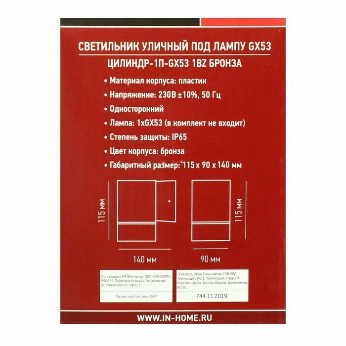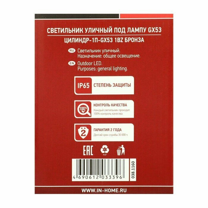 Светильник IN Home Цилиндр-1п, 30 Вт, Gx53, Ip65, архитектурный, односторонний, цвет бронза INhome 7 .