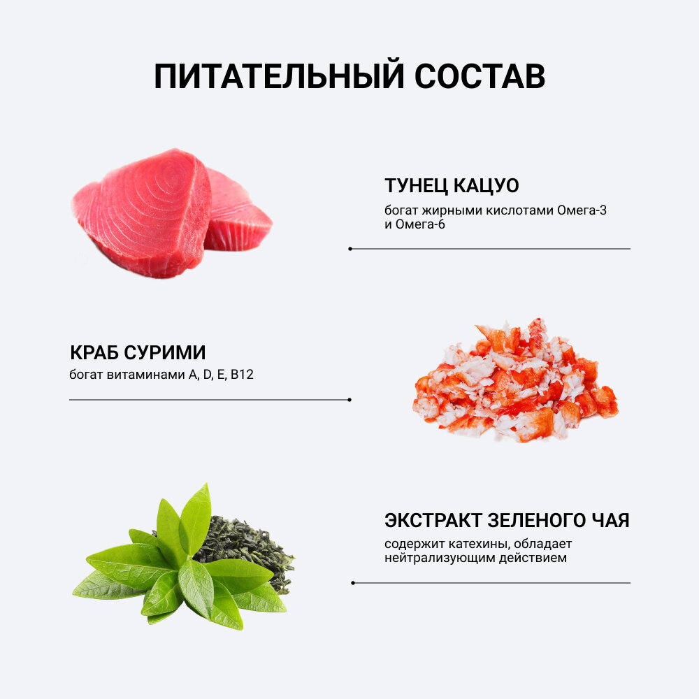 | Состав | тунец кацуо, тунец магуро, сурими со вкусом краба, дрожжевой экстракт, экстракт кацуобуси, экстракт водорослей, полисахариды, витамин Е, экстракт зеленого чая |