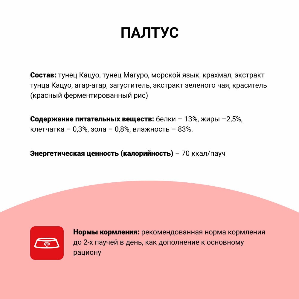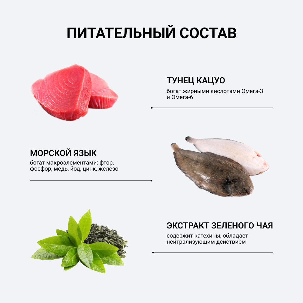 | Состав | тихоокеанский палтус, японский тунец-бонито, желтоперый тунец, морские водоросли, полисахариды, витамин Е, натуральный антиоксидант (экстракт японского чая – катехин) |
