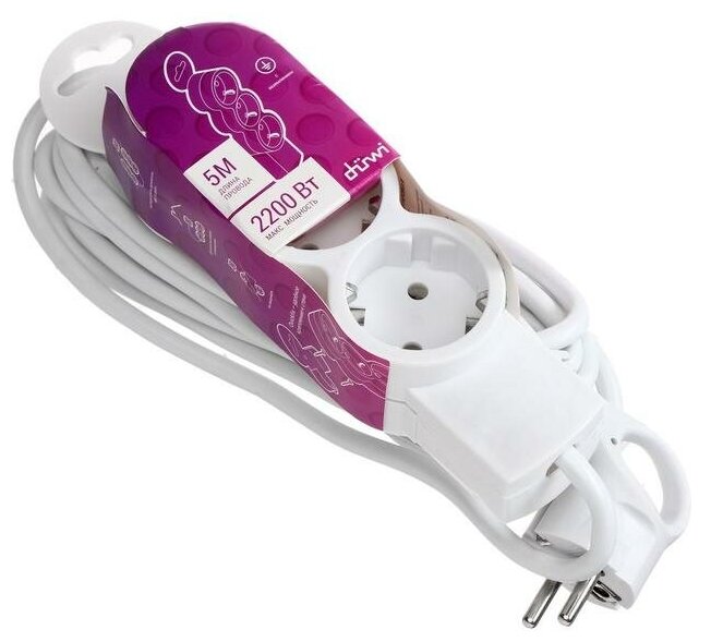 duwi Удлинитель Duwi, 3 розетки, 5 м, 10 А, 2200 Вт, ПВС 3х0.75 мм2, с з/к, белый