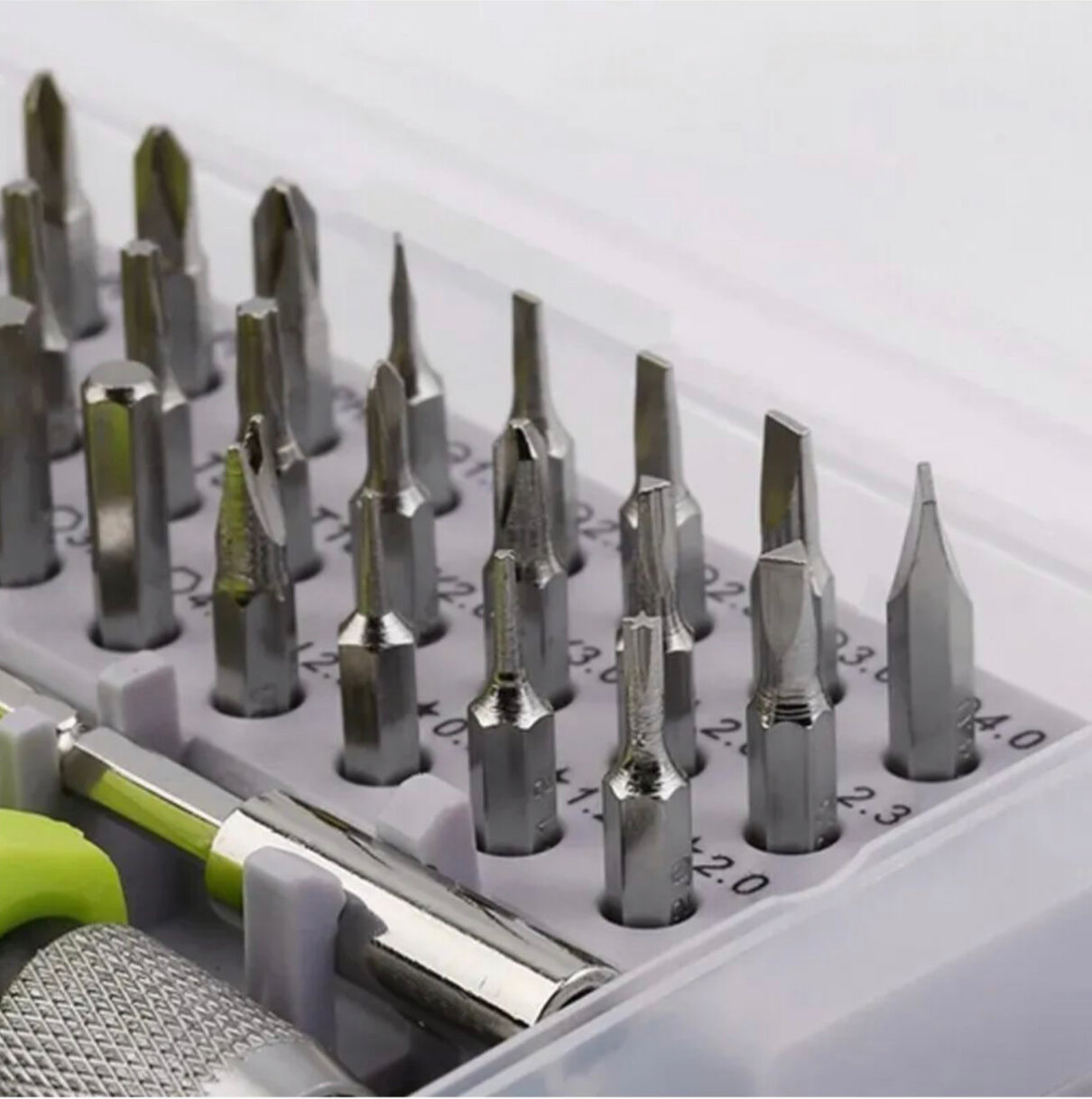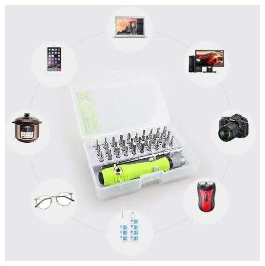 Прецизионный набор отвертка + биты в зеленом цвете - удобный помощник при ремонте электронных гаджетов и кухонного оборудования. В наборе 32 разных бита, позволяющих осуществлять работу с различными типами винтов. Рекомендую!