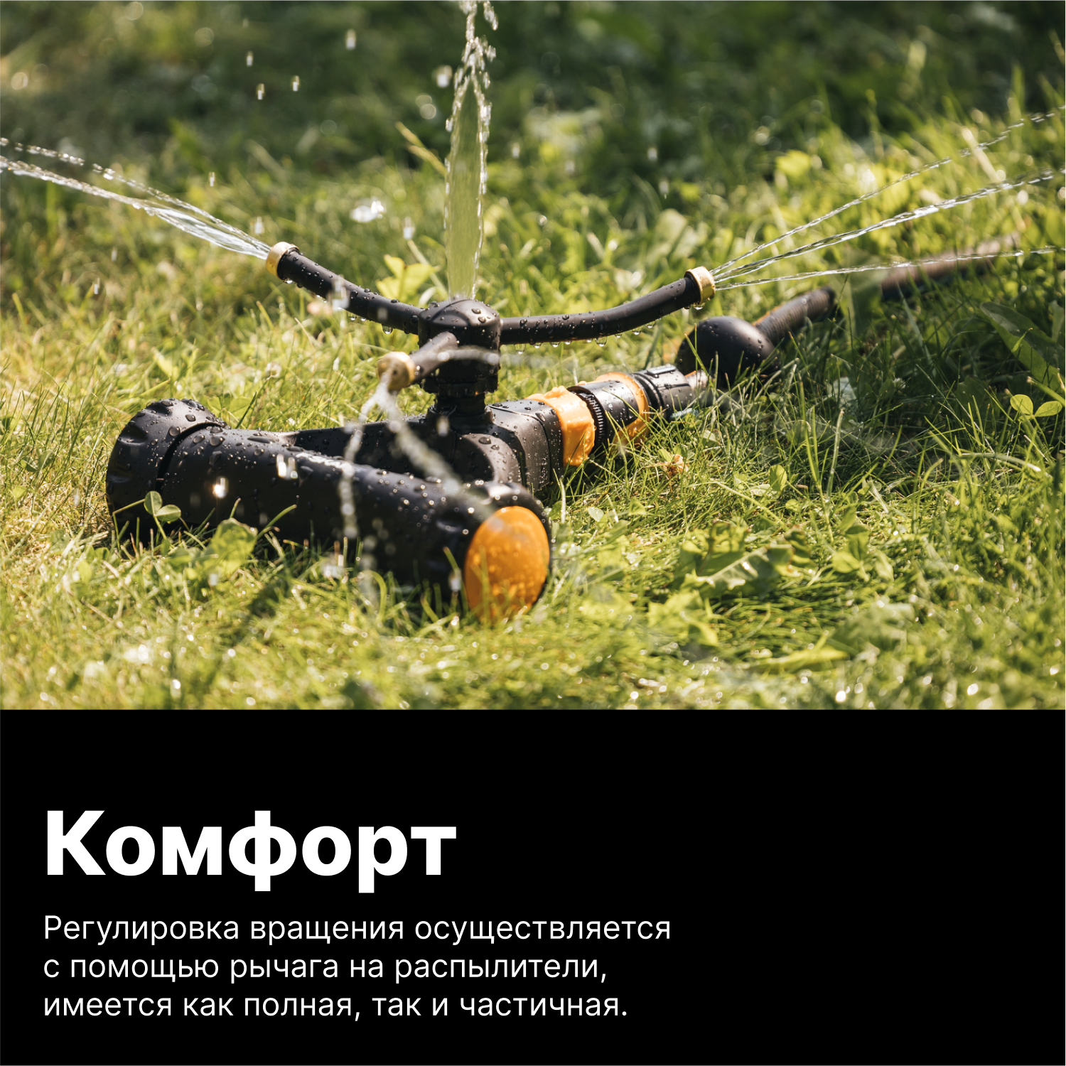 | Дополнительная информация | регулируемый угол поворота головки от 0 до 360º; дождеватель снабжен двумя соединительными гнездами, что позволяет использовать его в цепочке из нескольких дождевателей; регулировка потока воды от сильной струи до мягкого распыления |