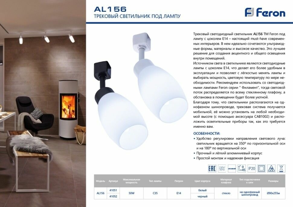 Светильник трековый Е14 матовый плафон с черным основанием Feron AL156 интересное: