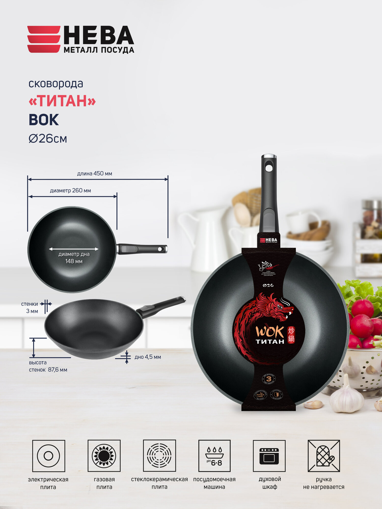Сковорода-вок НЕВА МЕТАЛЛ ПОСУДА Титан 3126, диаметр 26 см