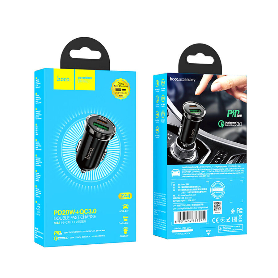 Автомобильное зарядное устройство HOCO Z44 Leading, 1xUSB + 1xUSB-C, 3A, 20W, черный