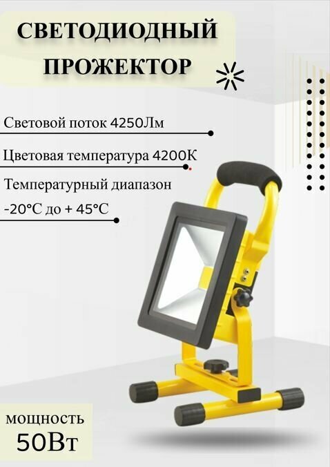 Светодиодный прожектор Foton Lighting Аккумуляторный 50Вт 220В 4200К Дневной белый 4250Лм IP65 черный 225x244x392мм 2900г, упаковка 1шт