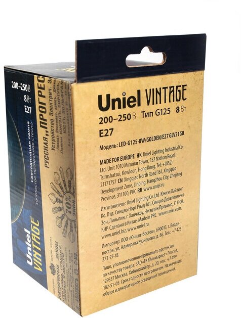 Светодиодная лампа Uniel Vintage LED-G125-8W/GOLDEN/E27 GLV21GO Форма «шар», золотистая колба. Картон. ТМ