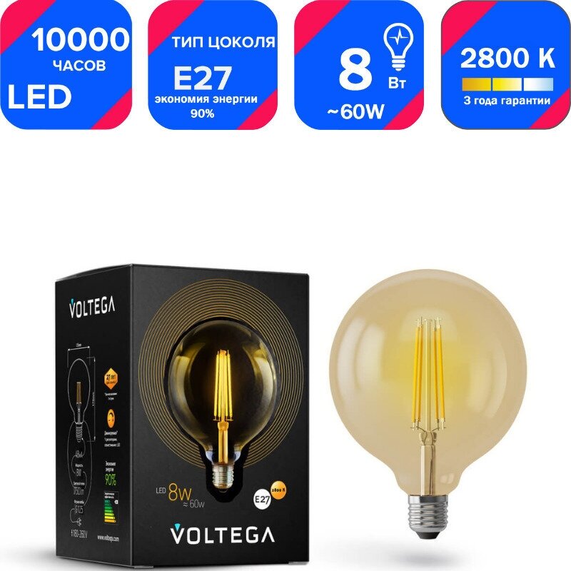 Лампа светодиодная Voltega 6838, E27, G125, 8 Вт, 2800 К