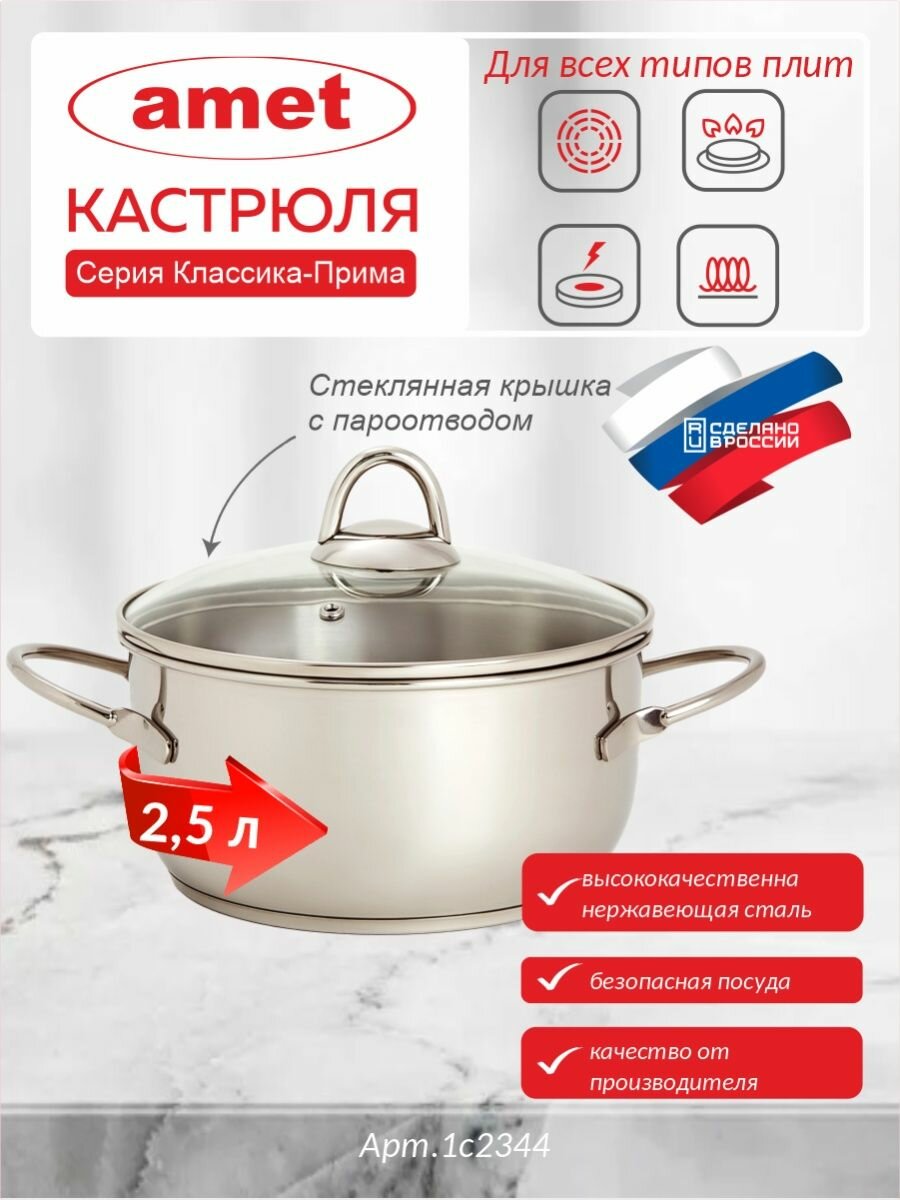 Кастрюля из нержавеющей стали Амет Классика-Прима со стеклянной крышкой 2.5л / посуда для газовых и электрических плит