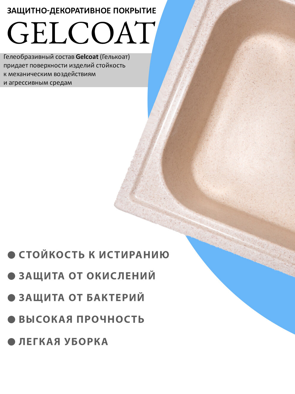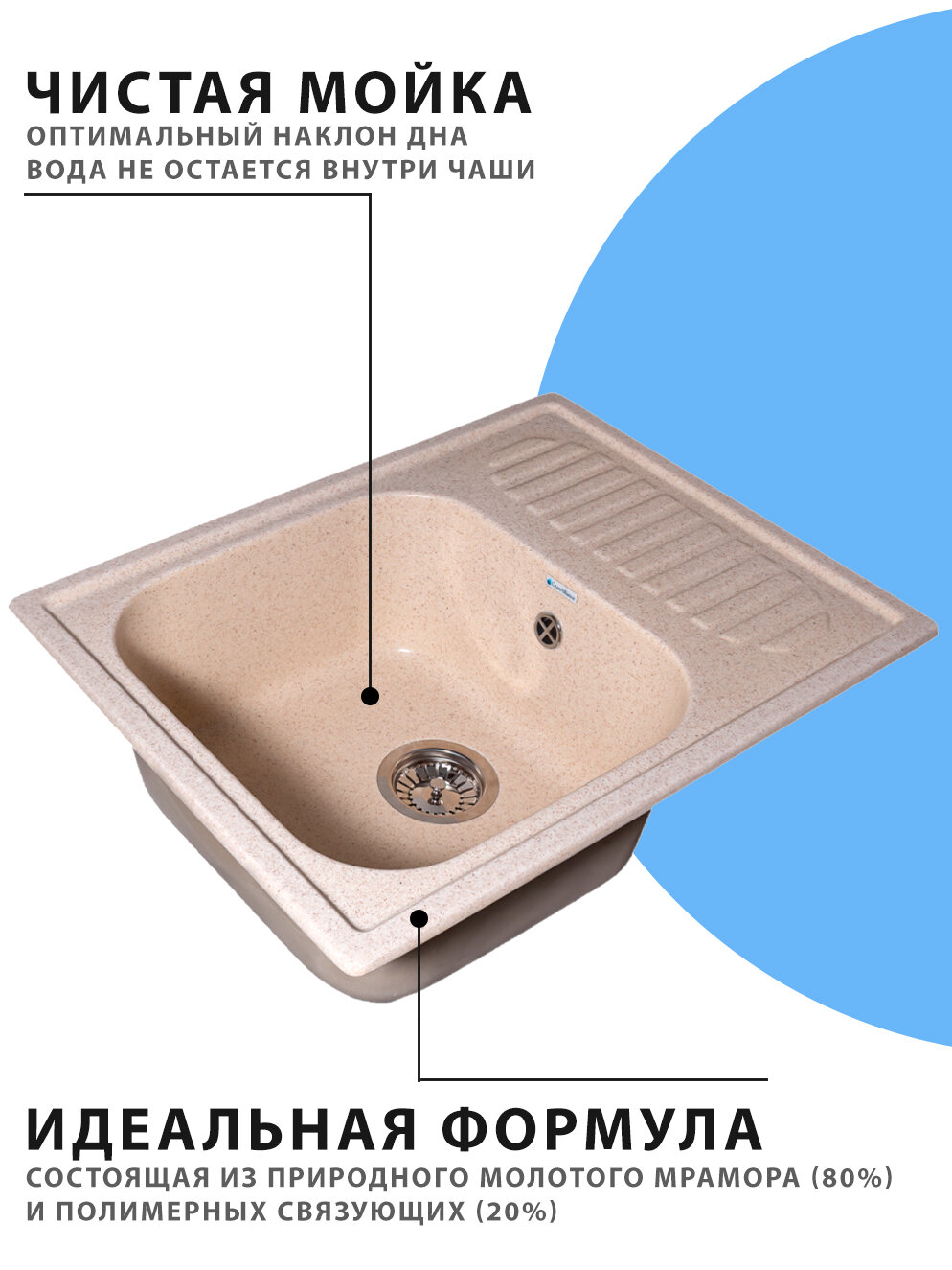 СохранитьВрезная мойка для кухни из искусственного камня GranAlliance, бежевая с сифоном (645х495х200) интересное: