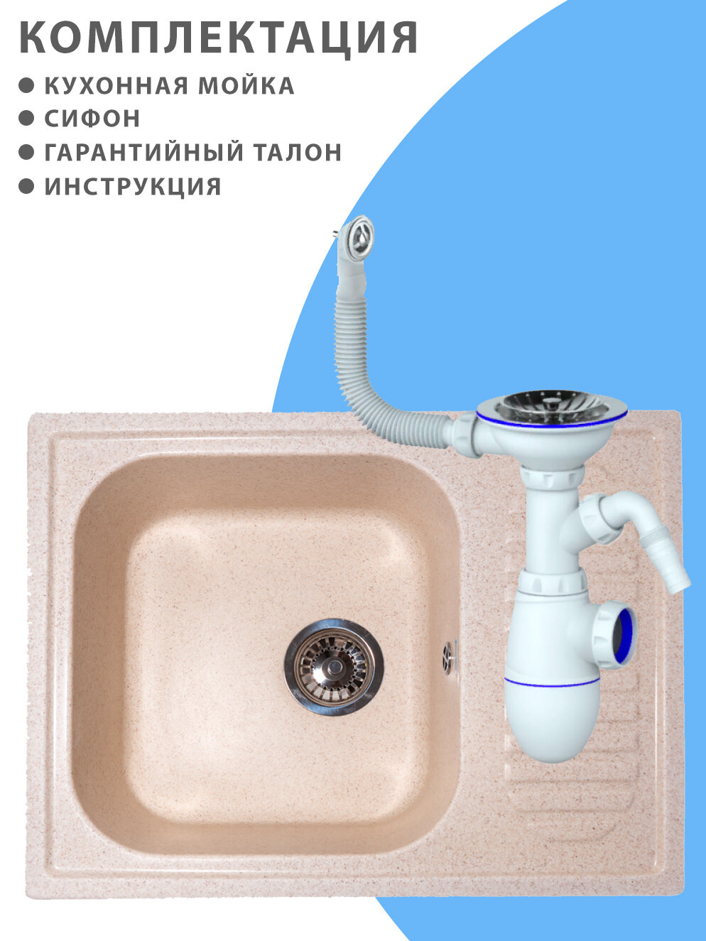 Купить Врезная мойка для кухни из искусственного камня GranAlliance, бежевая с сифоном (645х495х200)