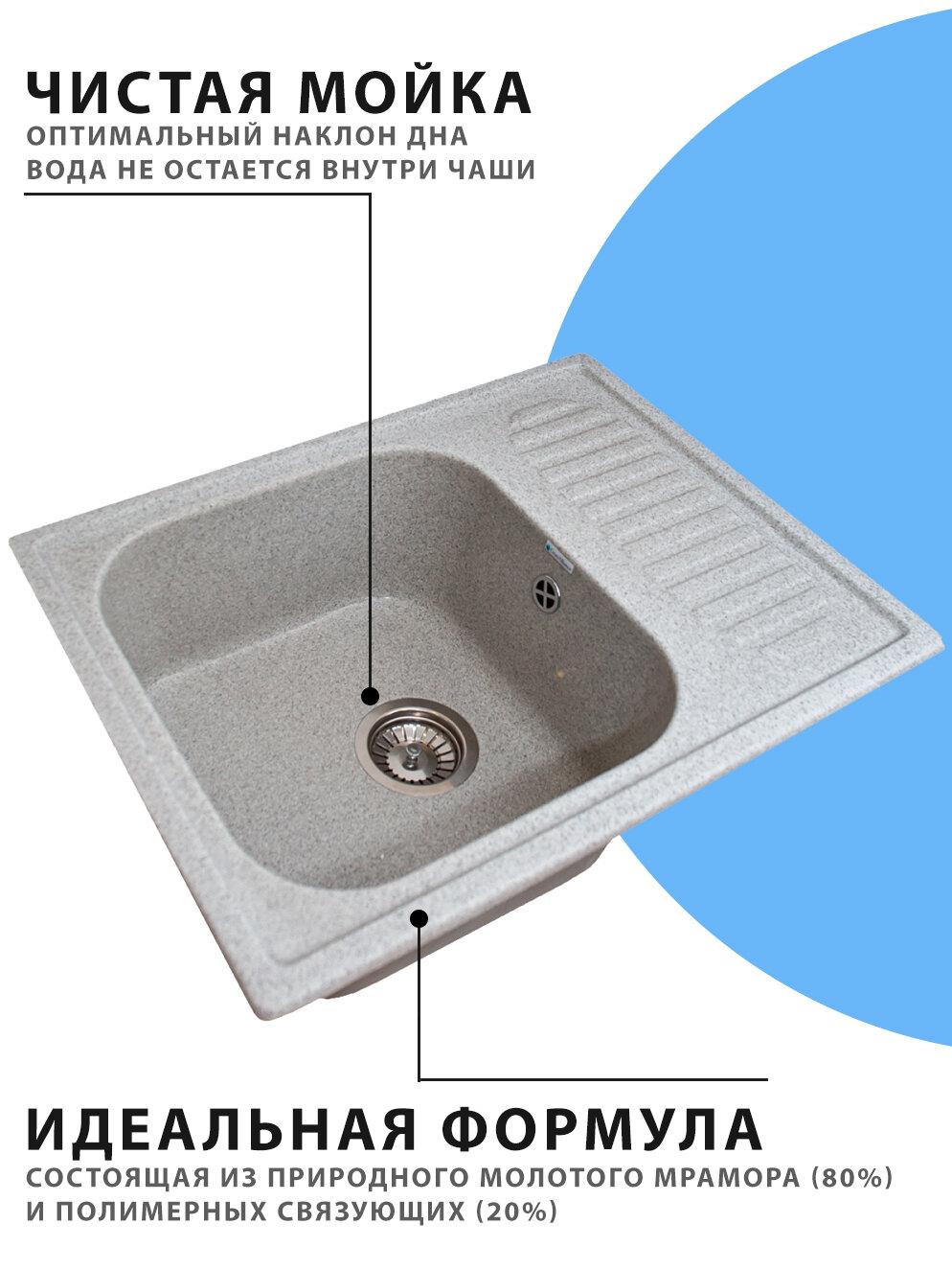 СохранитьВрезная мойка для кухни из искусственного камня GranAlliance, серая с сифоном (645х495х200) интересное: