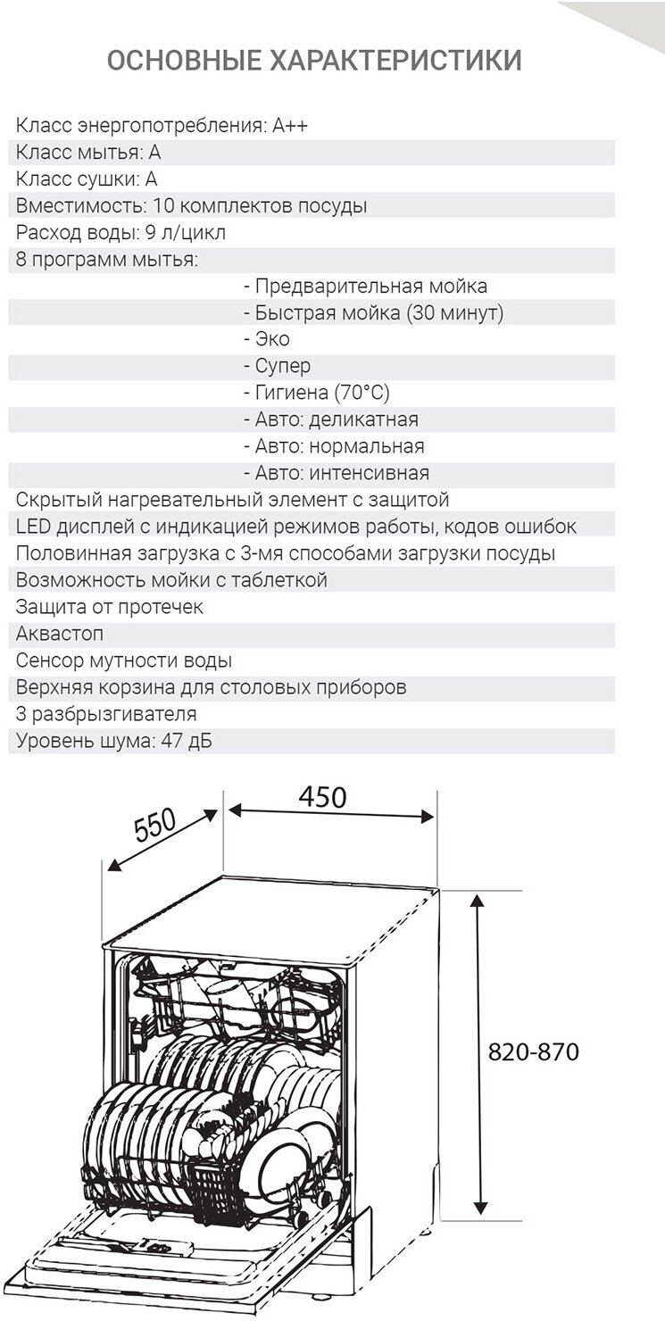 | Особенности конструкции | внутренняя поверхность из нержавеющей стали / дисплей / регулируемая по высоте корзина для посуды / сенсор чистоты воды / таймер отсрочки |