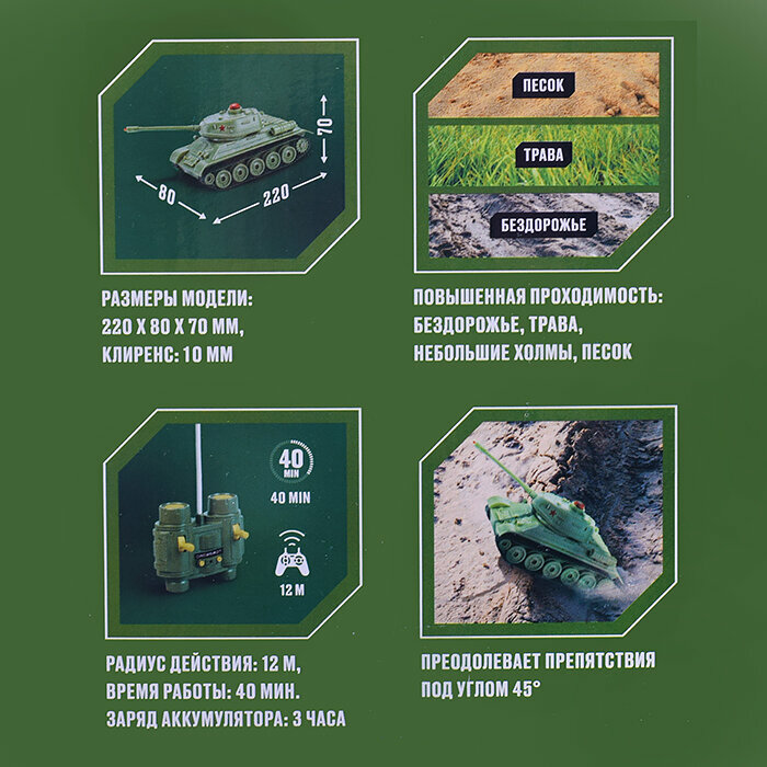 | Комплектация | танк: 1 шт., пульт радиоуправляемый, частота 27Мгц: 1 шт., аккумулятор NI-CD 600mah/3,6 V: 1 шт. USB-кабель для подзарядки: 1 шт., инструкция на русском языке: 1 шт. |