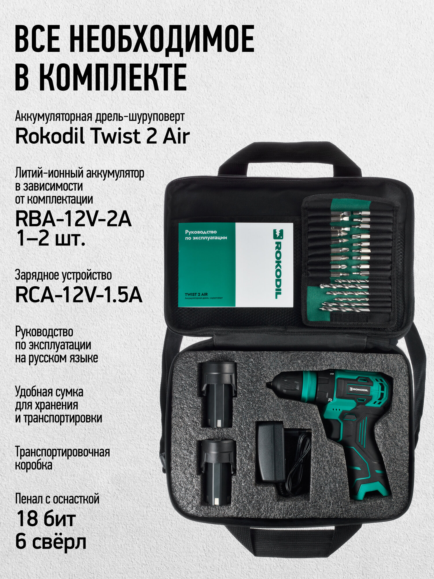 Купить Бесщеточный аккумуляторный шуруповерт Rokodil Twist 2 Air 12 В, 36 Нм, 2 Ач, 1400 об/мин (2 АКБ)