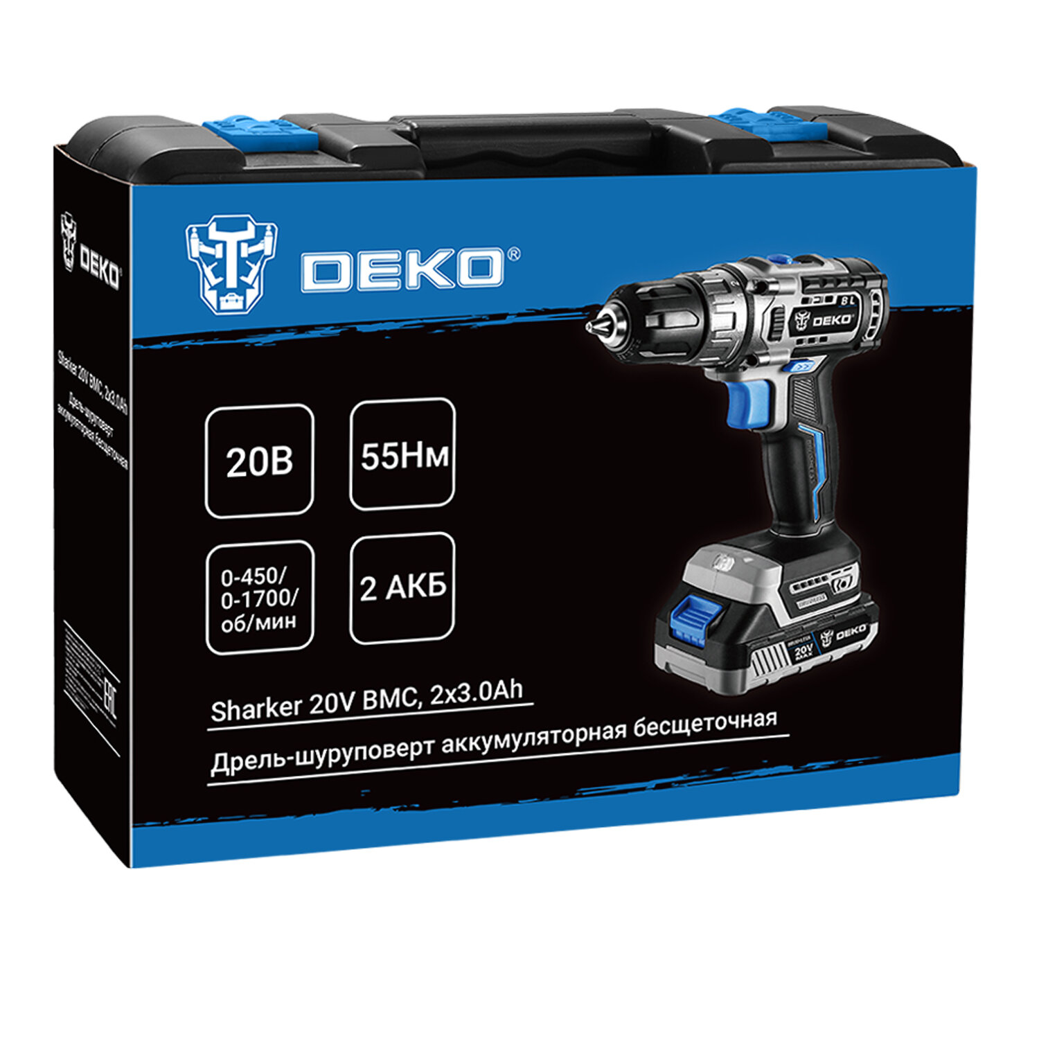 1 шт дрель аккумуляторная DEKO Sharker 20V 2 шт аккумулятор 1 шт зарядное устройство 6 шт сверла: 2,2,5,3,4,5,6 мм 6 шт биты: SL4,6, PH1,2, PZ1,2 1шт 60мм магнитный держатель бит 1шт руководство по эксплуатации 1шт кейс