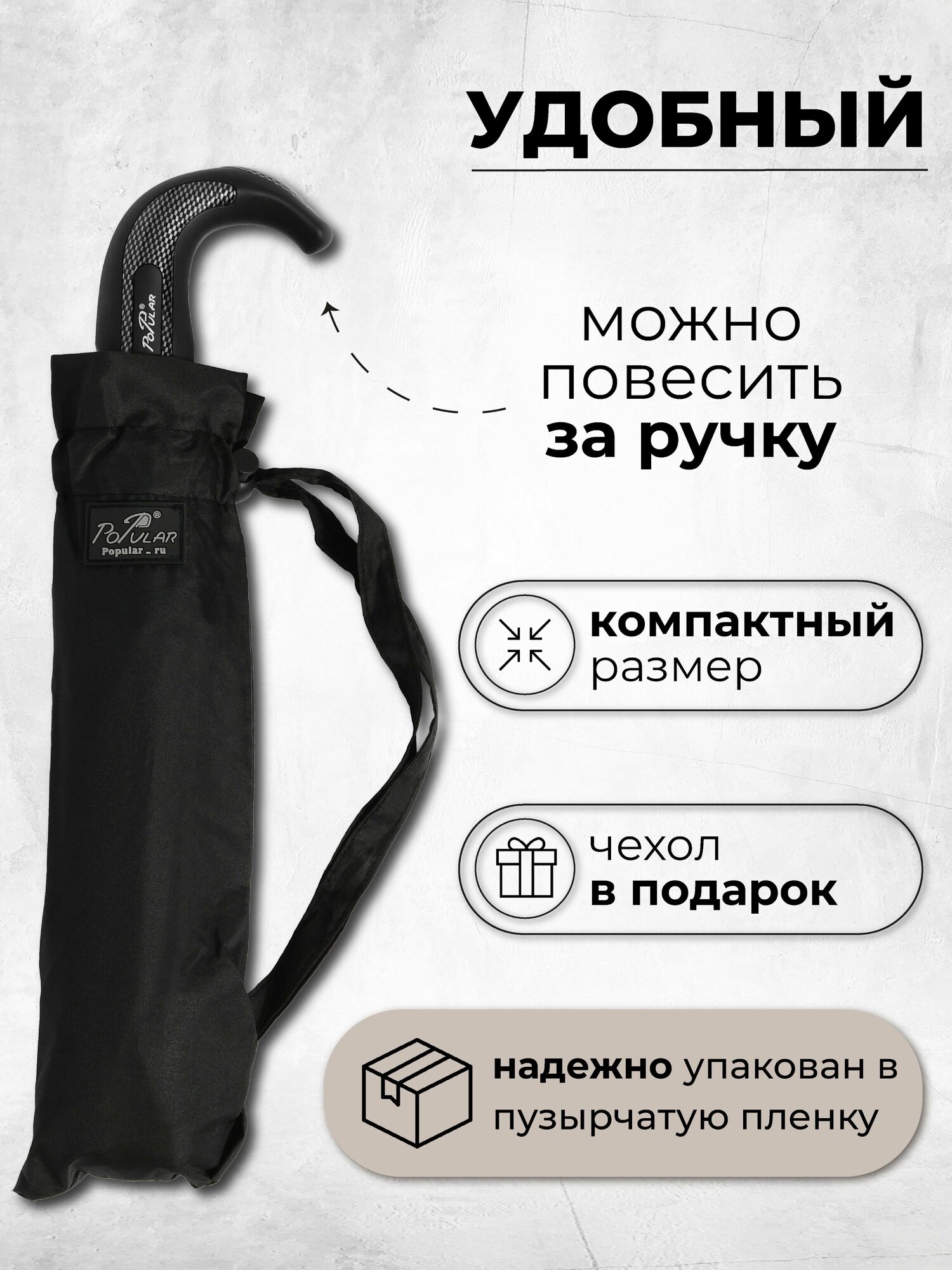 Зонт-шляпка Popular, полуавтомат, 3 сложения, купол 105 см., 9 спиц, система «антиветер», чехол в комплекте, для мужчин, черный интересное: