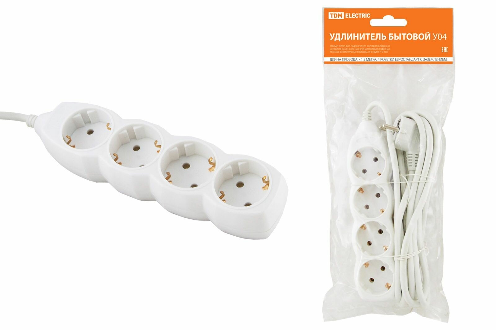 Удлинитель бытовой TDM У04, 4 гнезда, с заземлением, ПВС 3x1, 1,5м