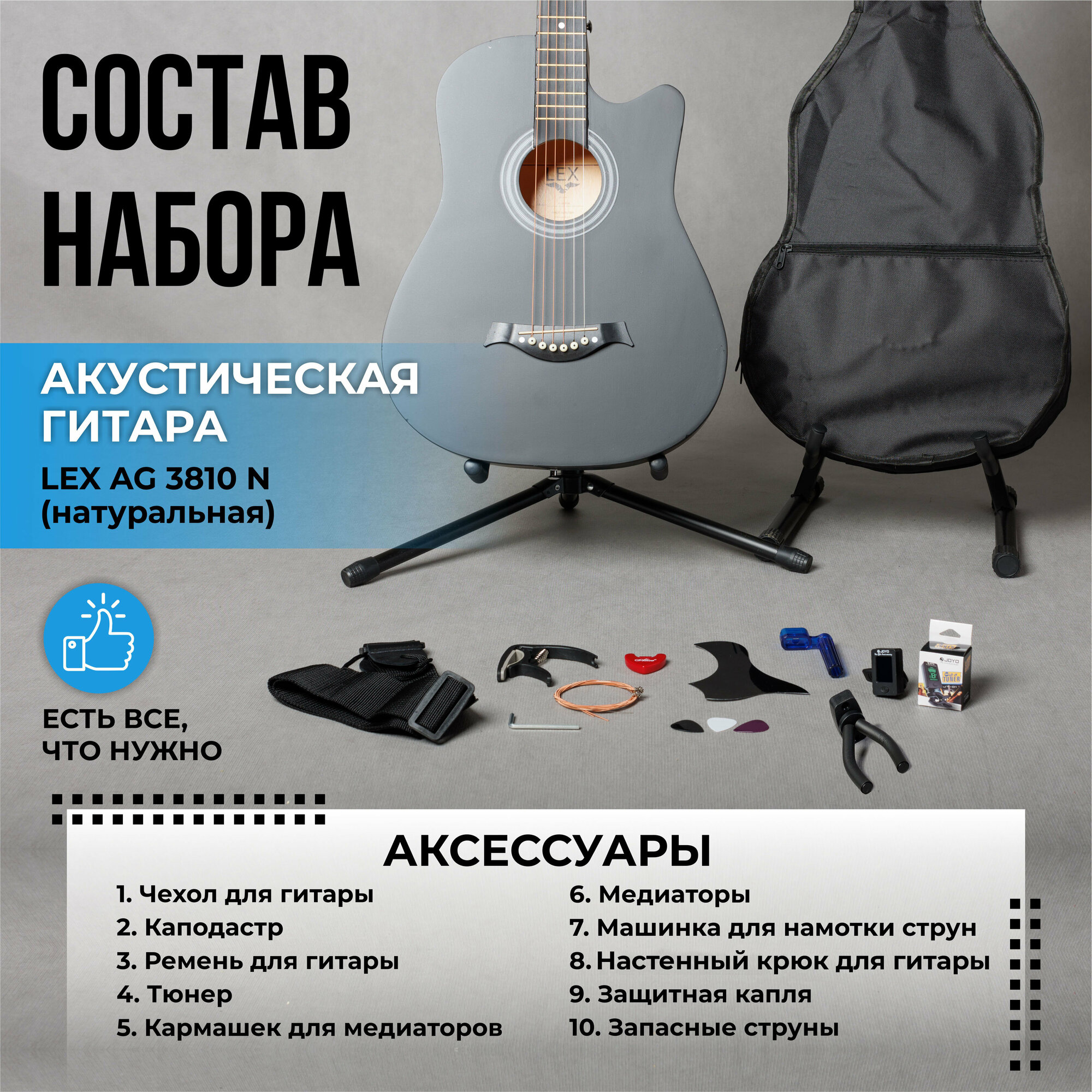 | В комплекте | 1.Акустическая гитара LEX AG3810 (натуральный цвет) - размер 7/8 (38) 2. Видео-курс по обучению игре на гитаре с нуля 3.Тюнер электронный для настройки гитары, можно использовать и для других струнных инструментов. 4. Стойка для гитары с грифодержателем 5. Чехол для гитары 6. Каподастр для легкого зажатия аккордов без барре 7.Ремень для гитары 8.Струны запасные на гитару (металл) 9. Несколько медиаторов 10. Декоративная "капля" на корпус гитары для защиты от ударов. 11. Кармашек для медиаторов. 12. Машинка для намотки струн. |