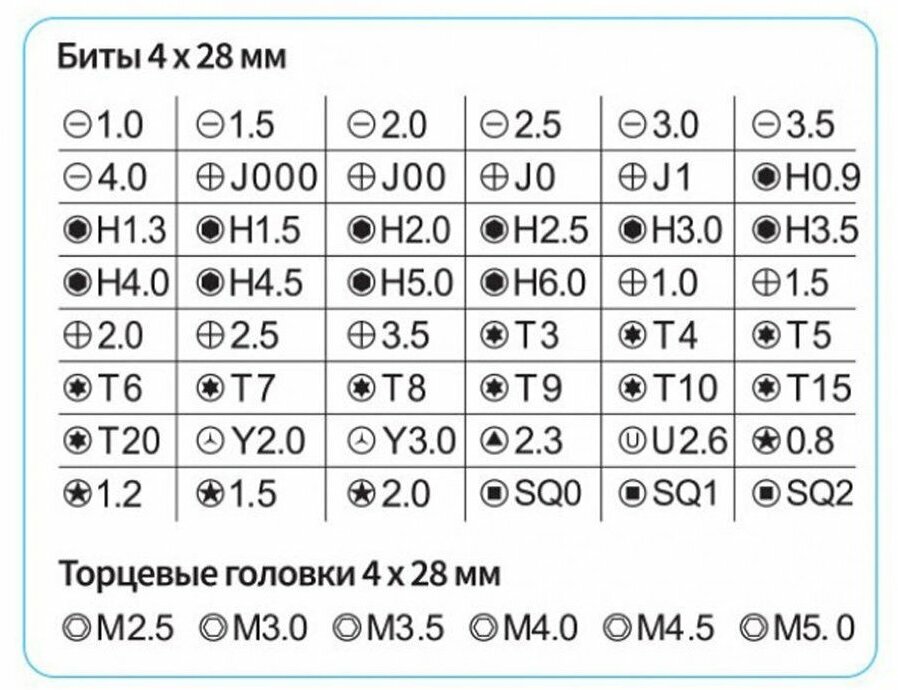 | Биты подробно | Pentalobe 0.8, Pentalobe 1.2, Pentalobe 1.5, Pentalobe 2.0, Spanner U2.6, Spanner U6, Spanner U8, Tri-wing 2, Tri-wing 3, Triangle 2.3, S0, S1, S2; SL 1 мм, SL 1.5 мм, SL 2.5 мм, SL 3 мм, SL 3.5 мм, SL 4 мм; PH 000, PH 00, PH 0, PH 1, PH 1.5, PH 2, PH 2.5, PH 3.5; HEX 0.9 мм, HEX 1.3 мм, HEX 1.5 мм, HEX 2 мм, HEX 2.5 мм, HEX 3 мм, HEX 3.5 мм, HEX 4 мм, HEX 4.5 мм, HEX 5 мм, HEX 6 мм; TORX T3, TORX T4, TORX T5, TORX T6, TORX T7, TORX T8, TORX T9, TORX T10, TORX T15, TORX T20 |