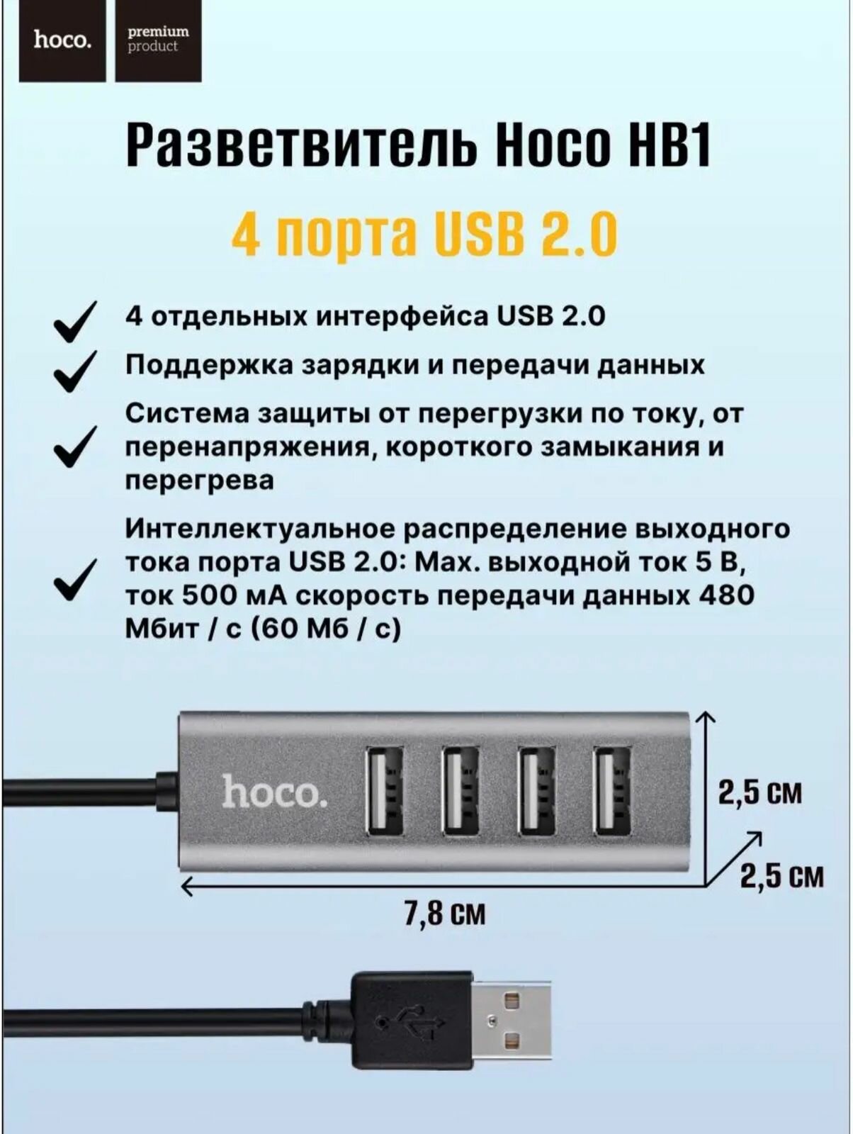 HUB разветвитель HOCO HB1, USB to 4USB 2.0, (USB 2:0 - 480 Мбит/с), 0.8m, серый интересное: