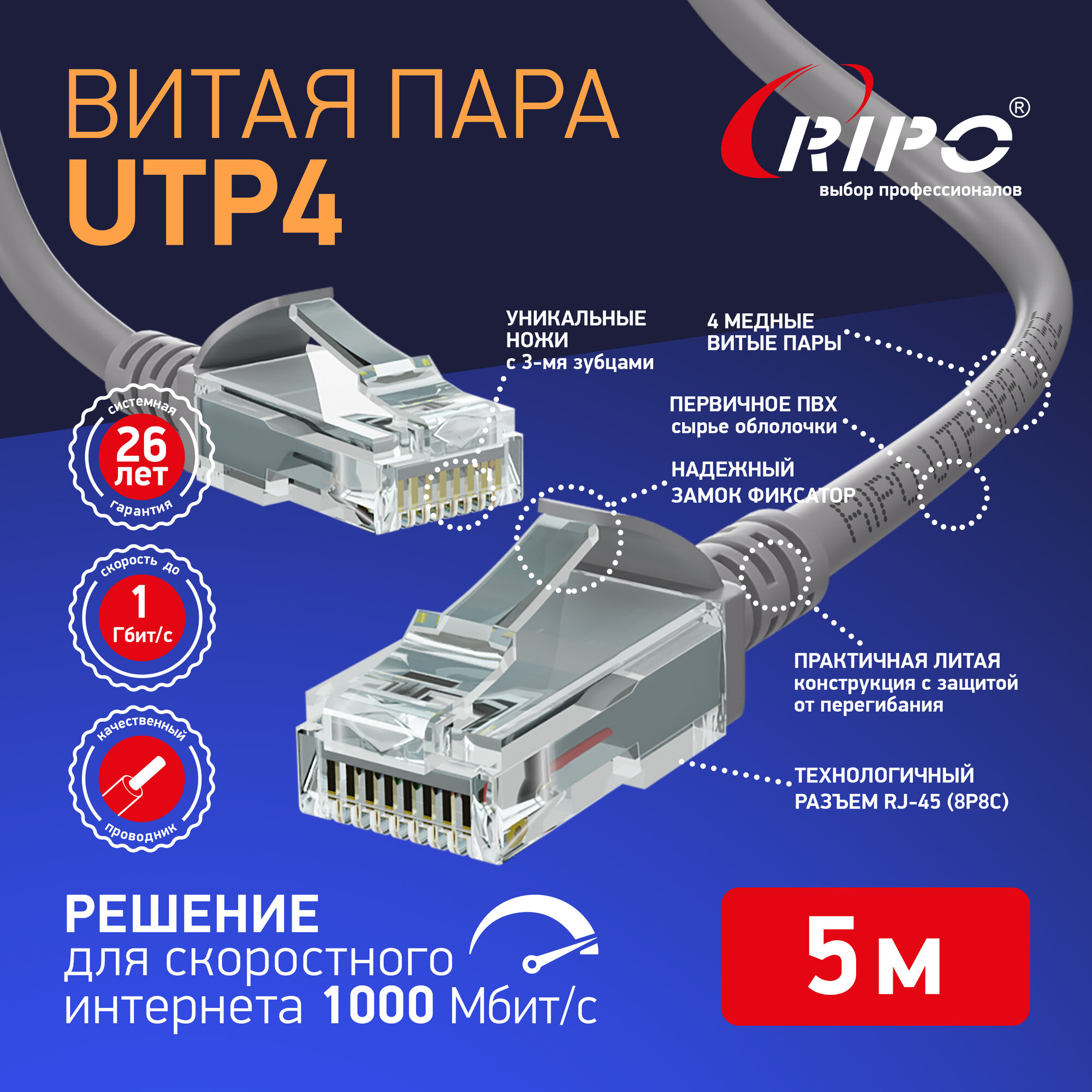 Купить Витая пара лан кабель для интернета Патч-корд сетевой шнур провод для интернета UTP Кат.5е rj-45 RIPO литой медный 8 жил Cu 5 метров 003-300111