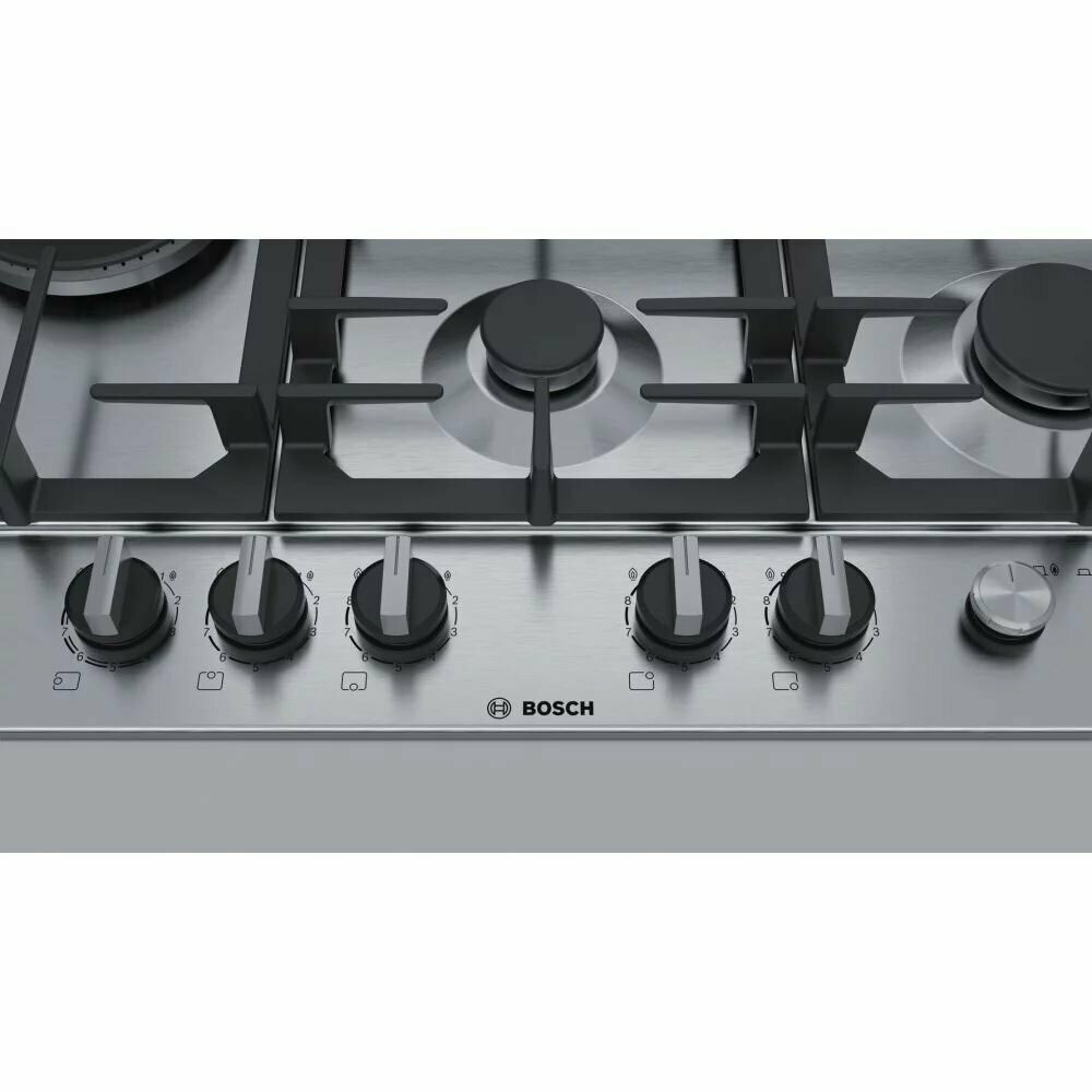 Варочная панель газовая Bosch PCS7A5M90, конфорок - 5 шт, электроподжиг, газ-контроль, серебристый