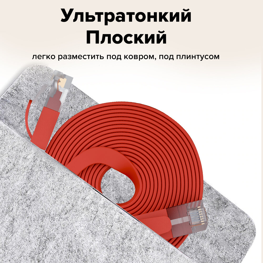 Патч-корд плоский 15 метров кабель для интернета GCR PROF КАТ.6 ethernet high speed 10 Гбит/с красный