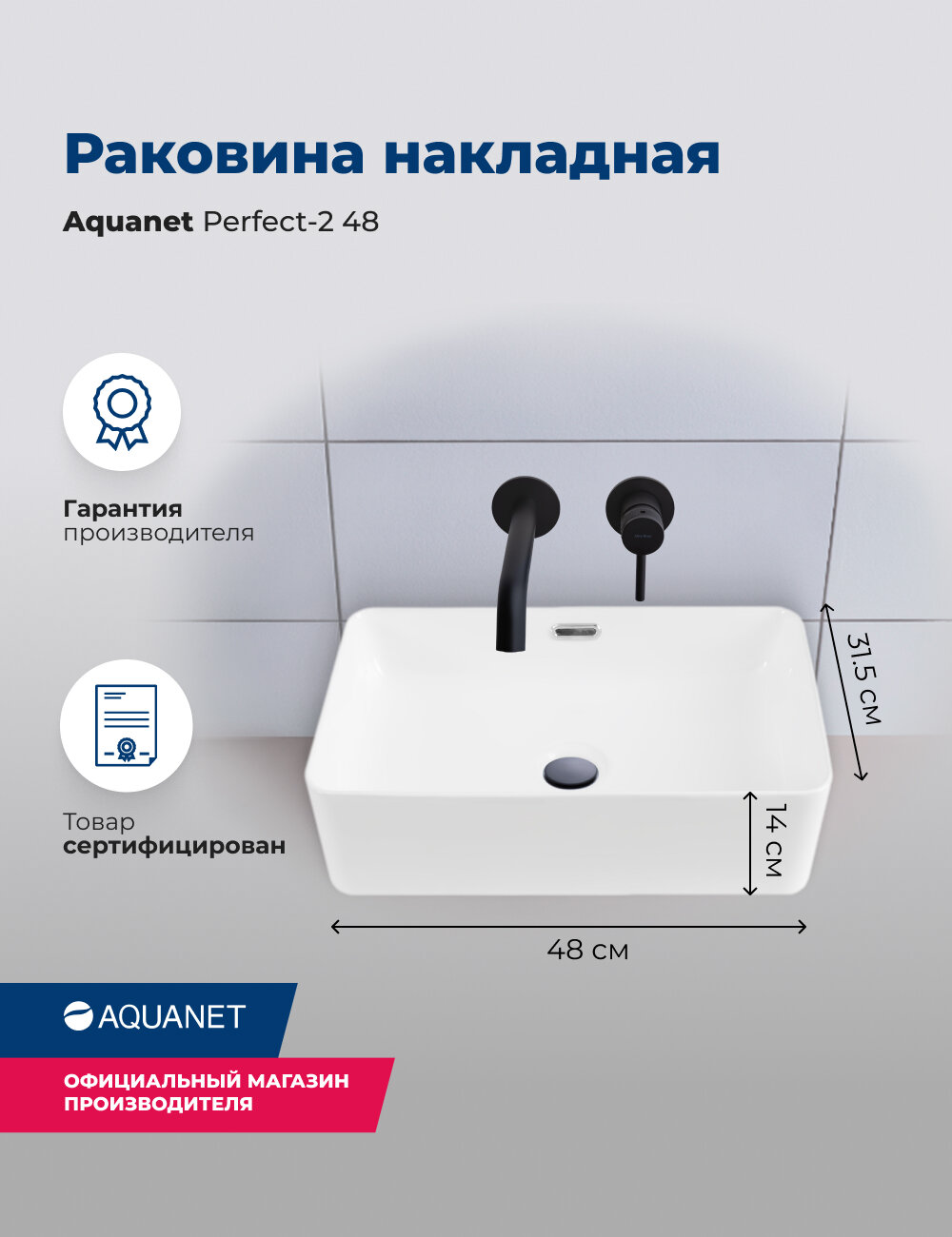 Раковина накладная Aquanet Perfect-2 48 белый