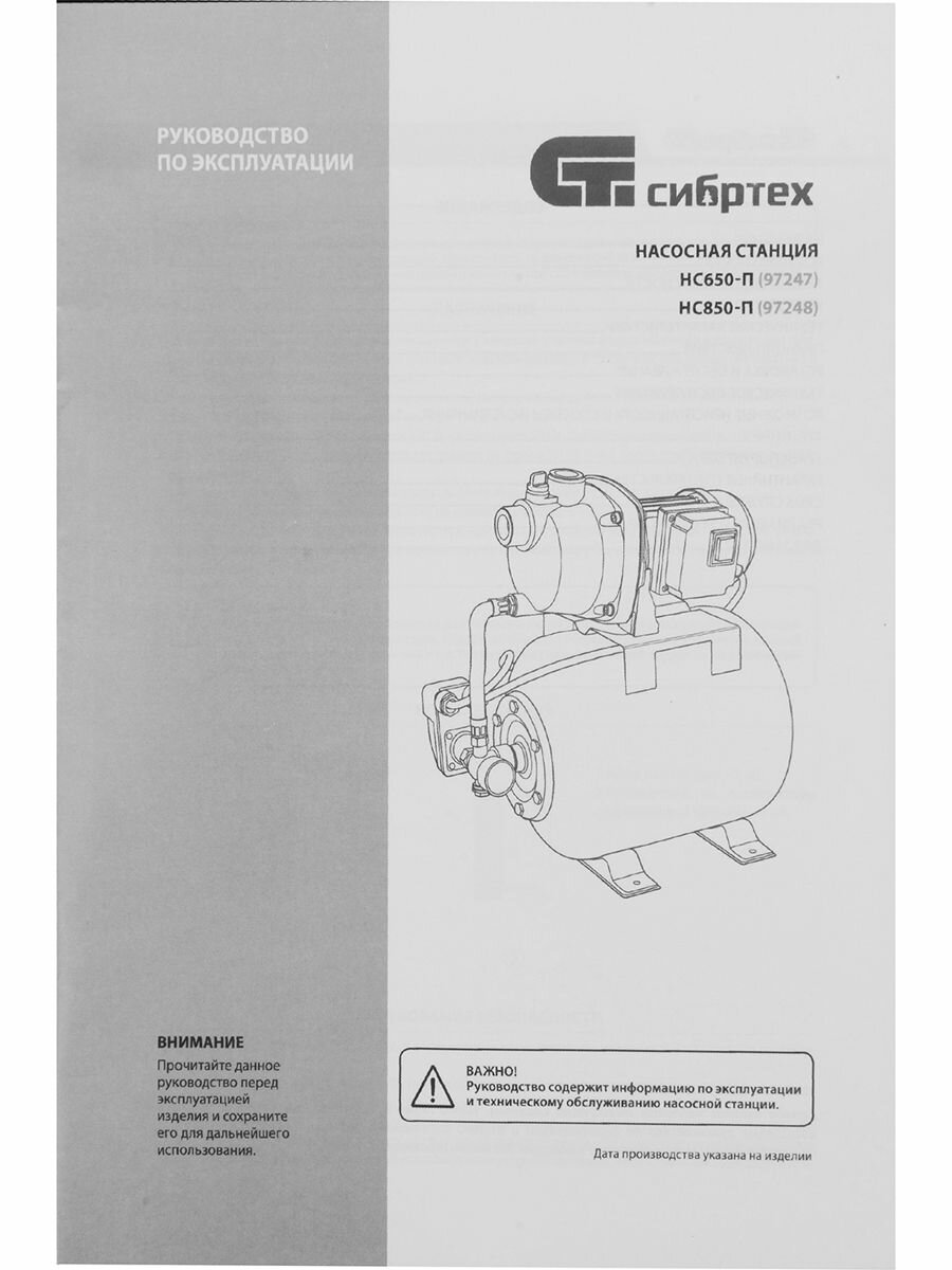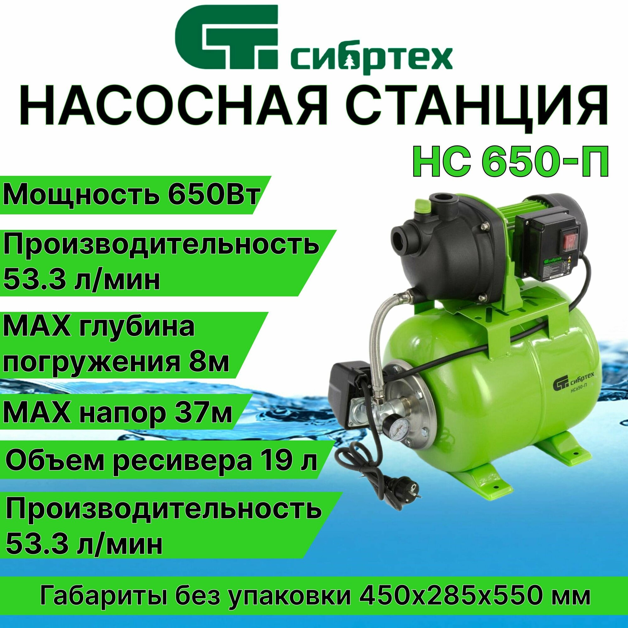 Насосная станция Сибртех, 1.2 м, 650 Вт, диаметр 1 мм, глубина погружения 8 м, максимальный напор 37 м, 3.2 м³/ч, НС650-П