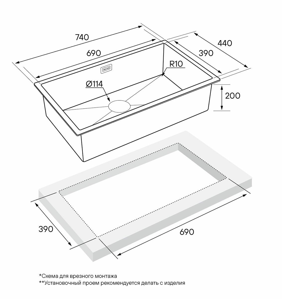 Кухонная мойка из нержавеющей стали AISI 304 Paulmark KOHER, 740х440 мм, шумопоглащающее покрытие, универсальный монтаж, цвет брашированная сталь, PM807444-BS