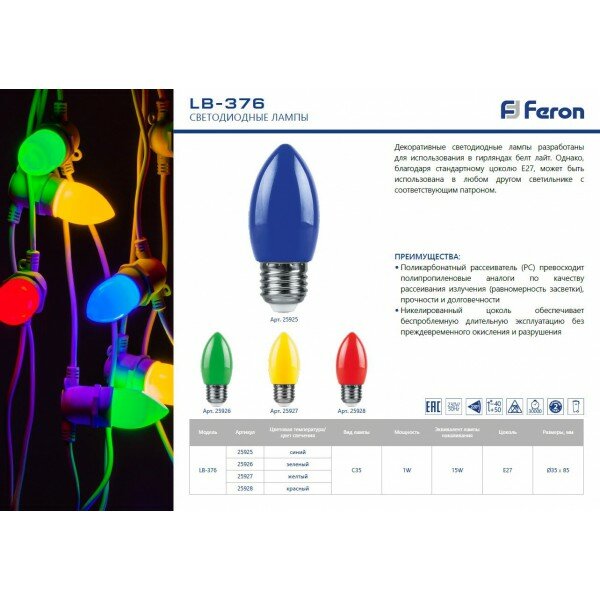 Светодиодная лампа FERON 1W 230V E27 синий, LB-376 25925