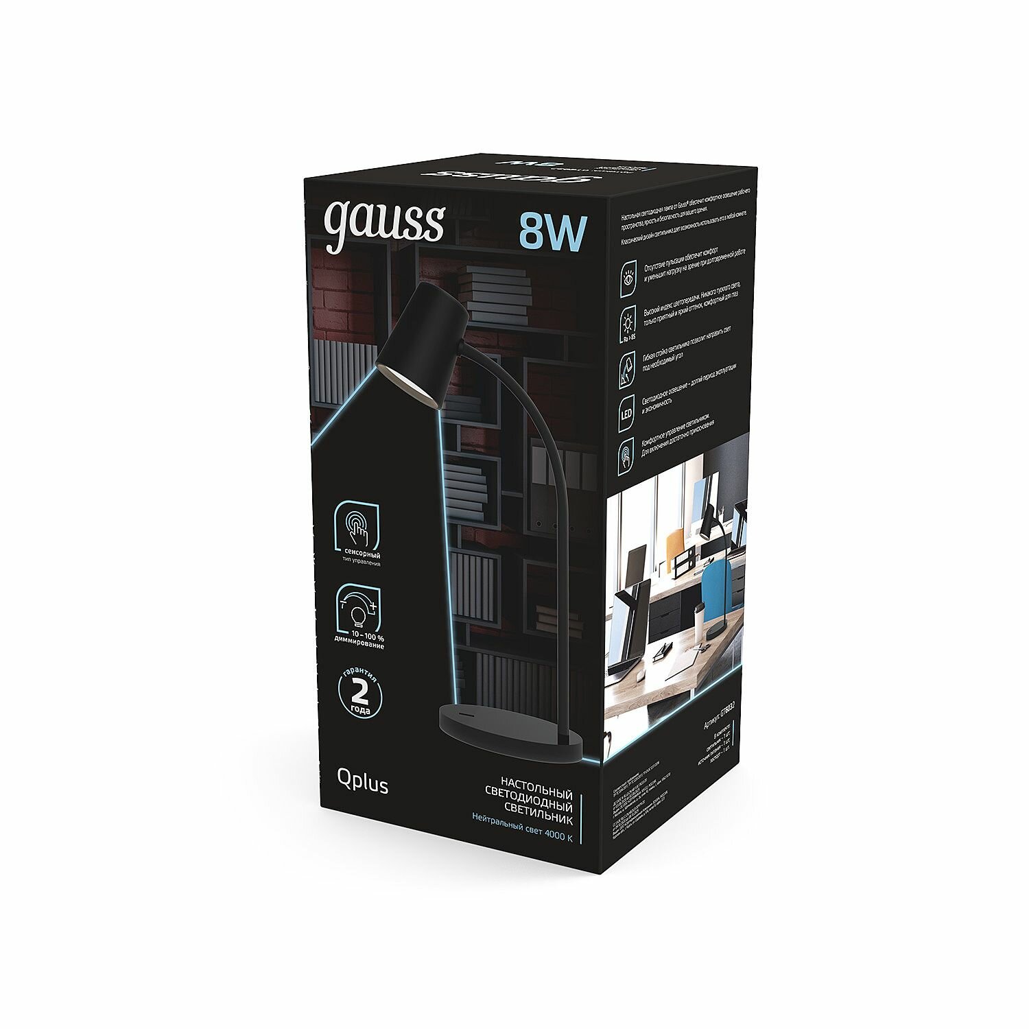 Gauss Светильник настольный Qplus модель 8W 600lm 4000K 170-265V черный диммируемый LED 1/8 GT6032