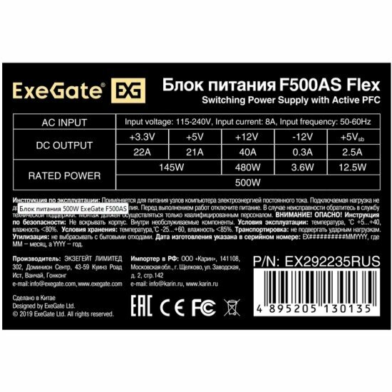 Блок питания EXEGATE F500AS 500W Flex ATX EX292235RUS интересное: