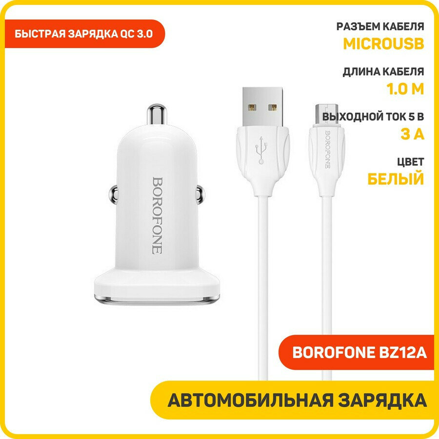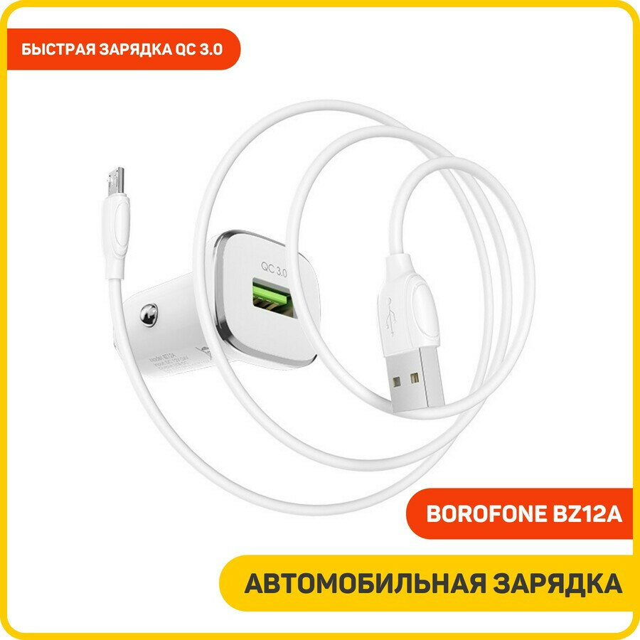 Автомобильное зарядное устройство (АЗУ) Borofone BZ12A QC 3.0 (USB) + кабель MicroUSB, 3 А, белый