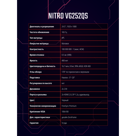 24.5" Монитор Acer Nitro VG252QSbmiipx, 1920x1080, 165 Гц, IPS, черный