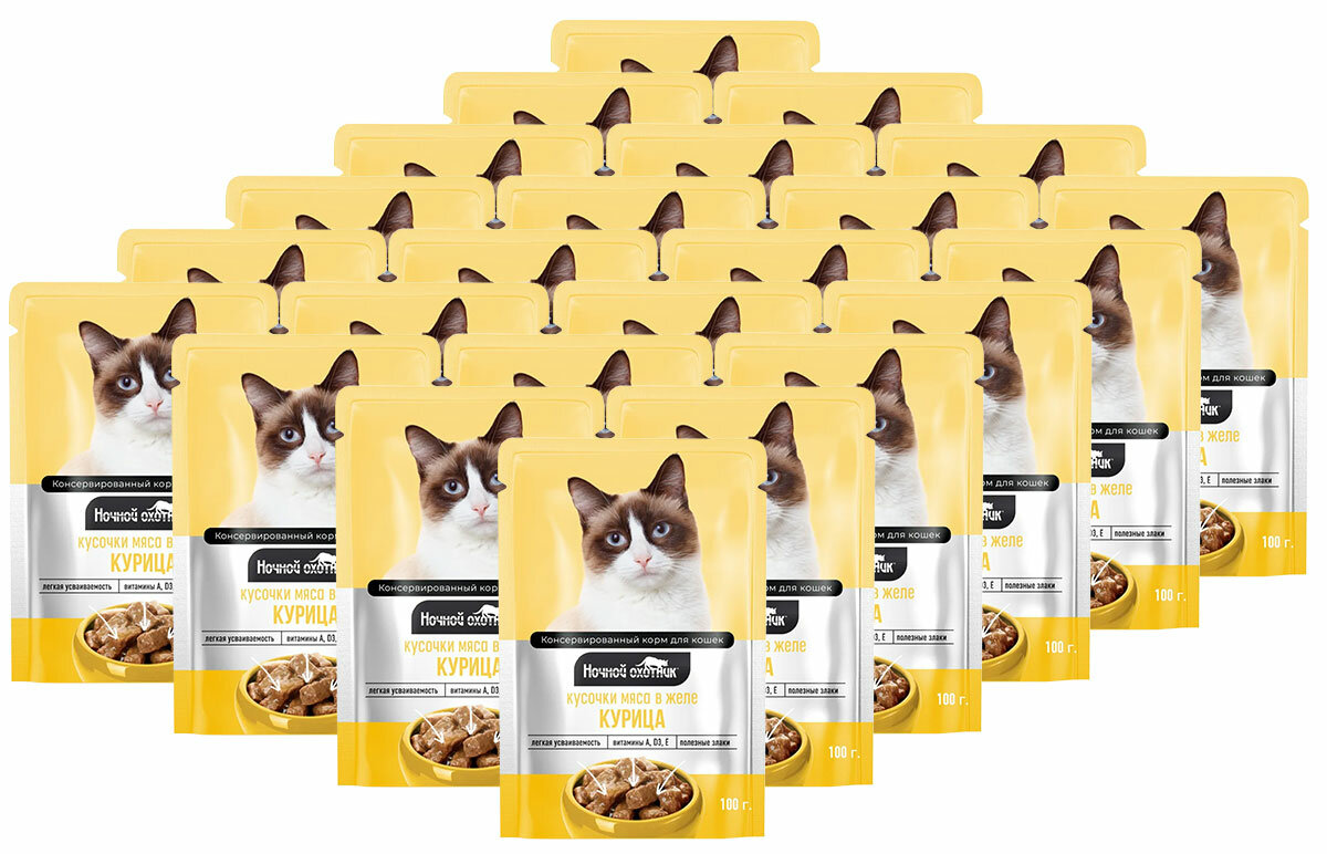 Ночной охотник влажный корм для взрослых кошек всех пород, курица в желе 100 гр (34 шт)