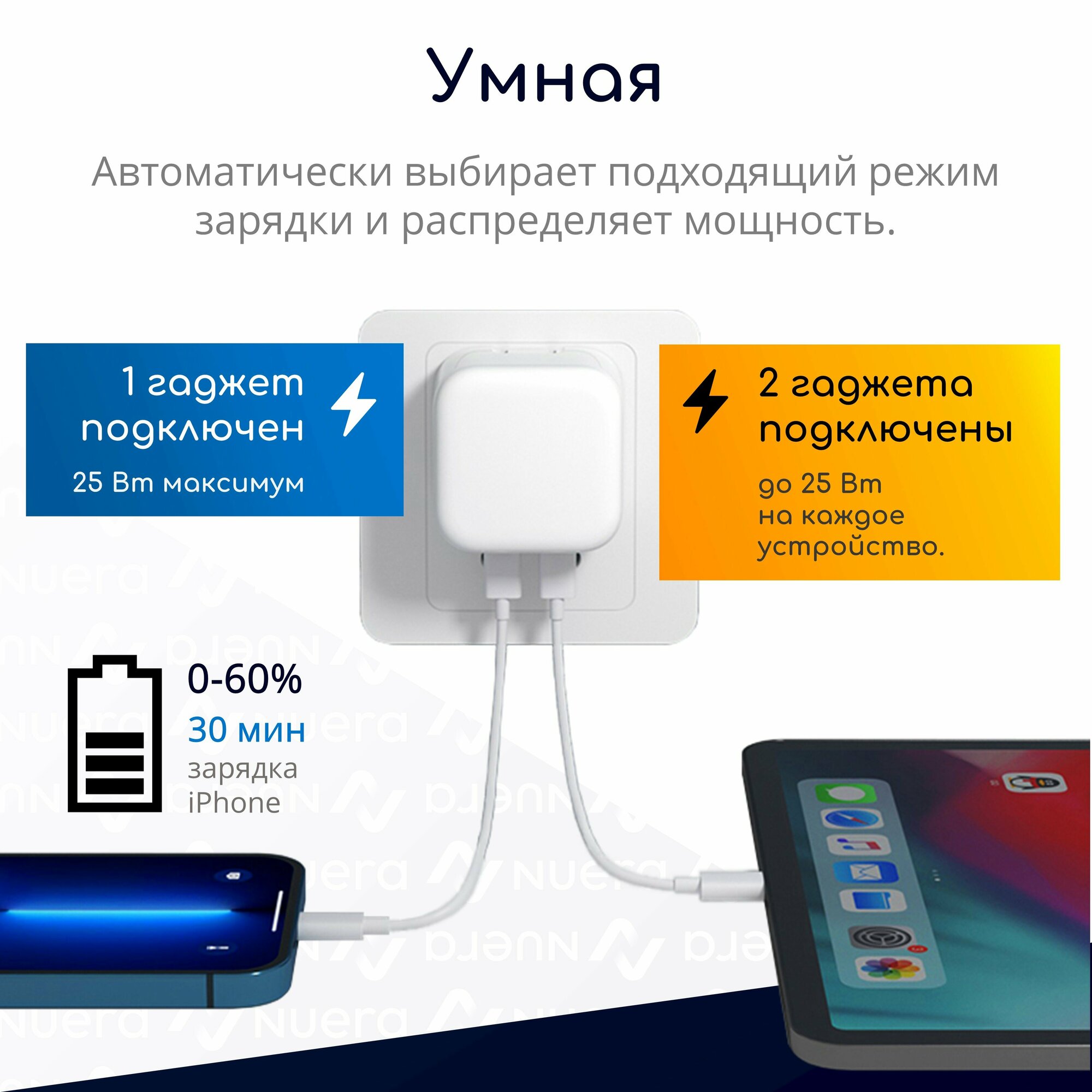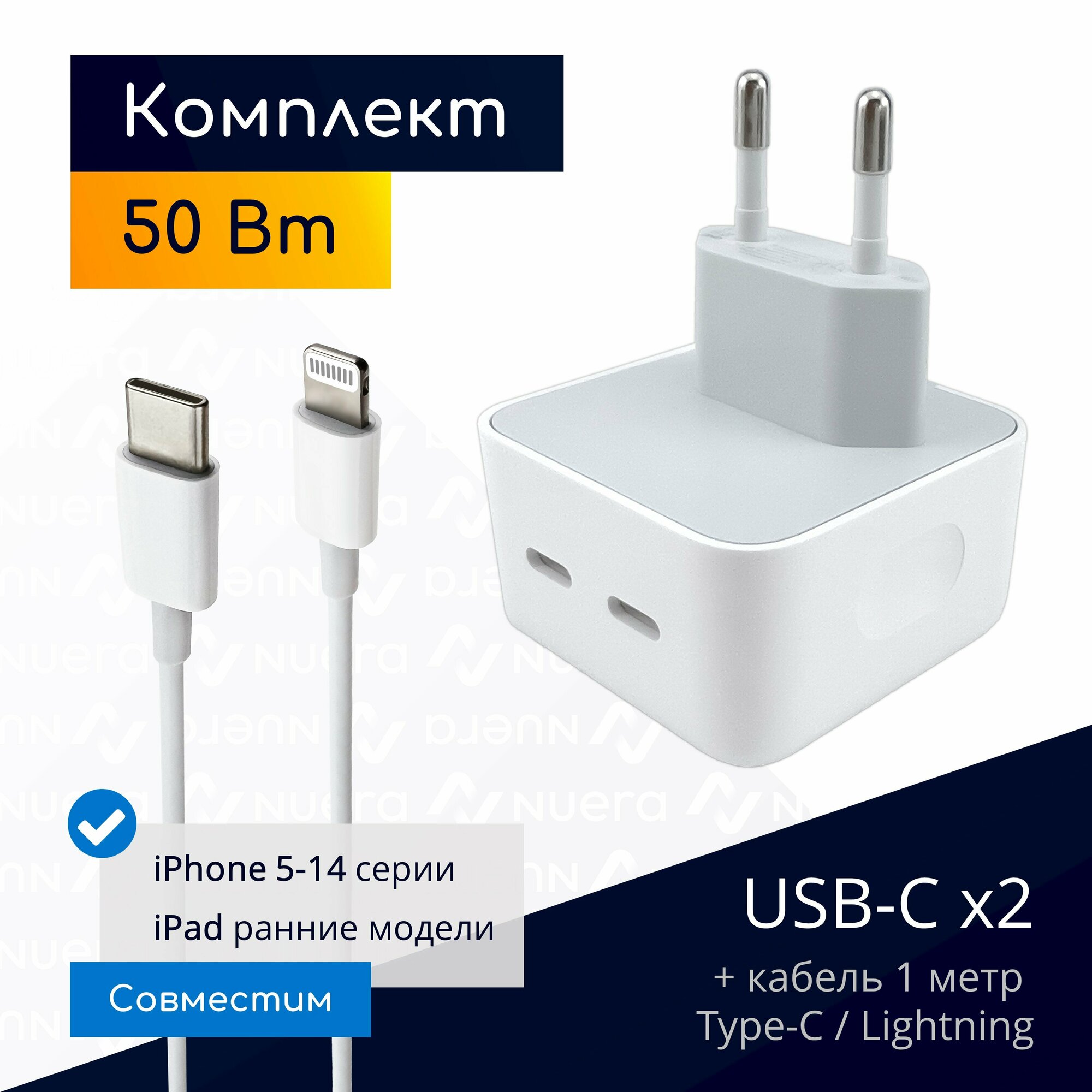 Комплект 2 в 1: быстрое сетевое зарядное устройство 50 Вт на 2 разъема USB-C + кабель USB-C - Lightning (1 метр) для iPhone и iPad