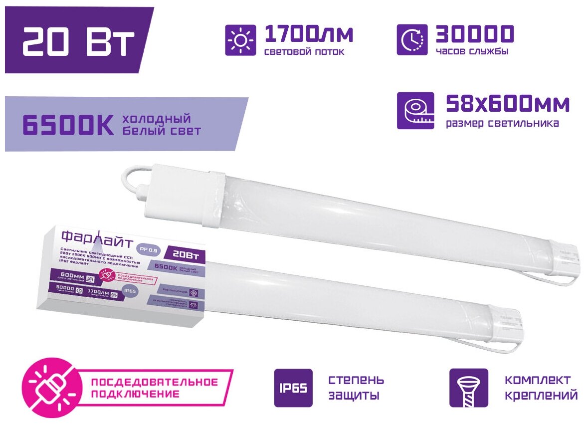 Светильник светодиодный ССП 20Вт 6500K 600мм с возможностью последовательного подключения IP65 Фарлайт интересное: