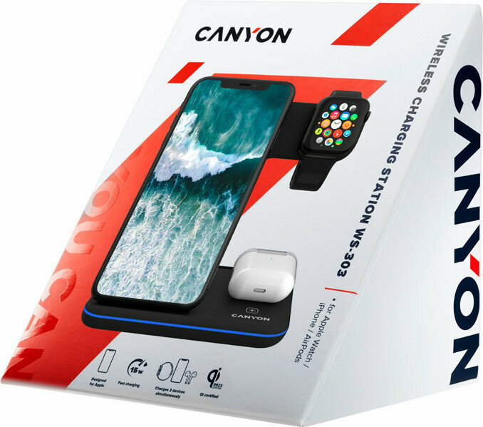 Беспроводное зарядное устройство 3 в 1 Canyon WS-303, с поддержкой Qi. до 15Вт, Черный, CNS-WCS303B