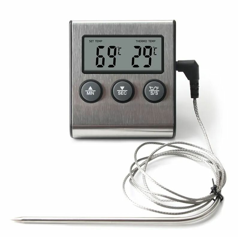 Кулинарный термометр электронный со щупом из нержавеющей стали, термометр для еды, мяса, вина, провод 1 метр / таймер кухонный