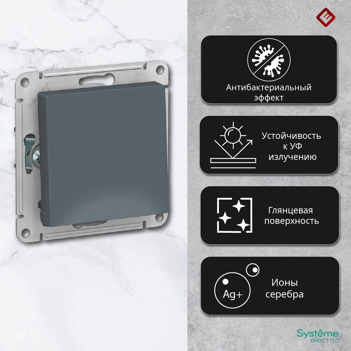 Выключатель одноклавишный с подсветкой (грифель), сх.1а, 10АХ, механизм Schneider Electric AtlasDesign (комплект 9шт)