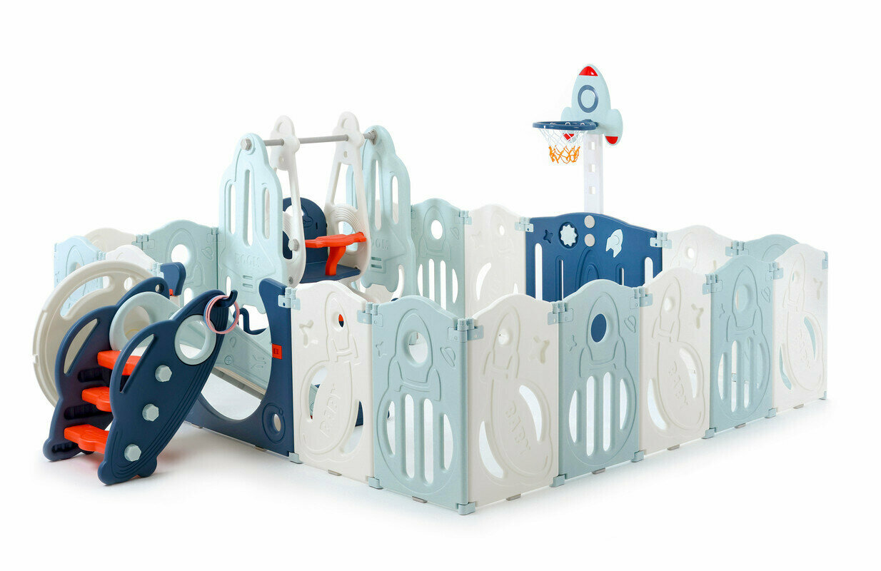 Купить Манеж UNIX Kids "SUPREME Space" Blue, голубой/синий, 200x240 см, с качелями, ковриком, горкой и баскетбольным кольцом для дома и улицы
