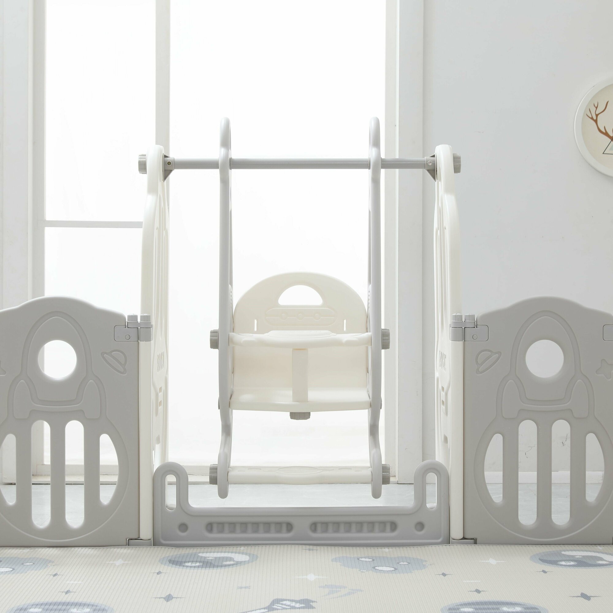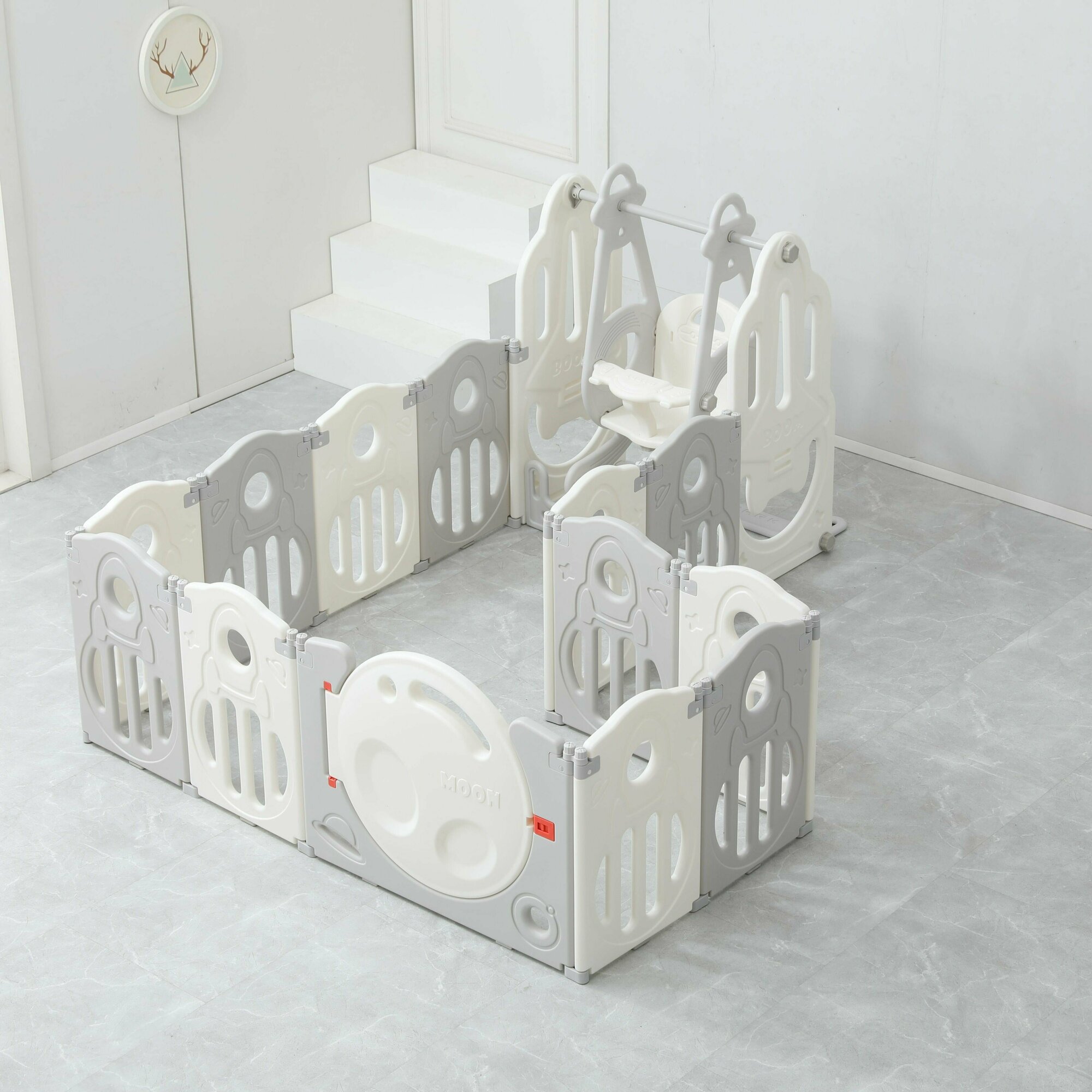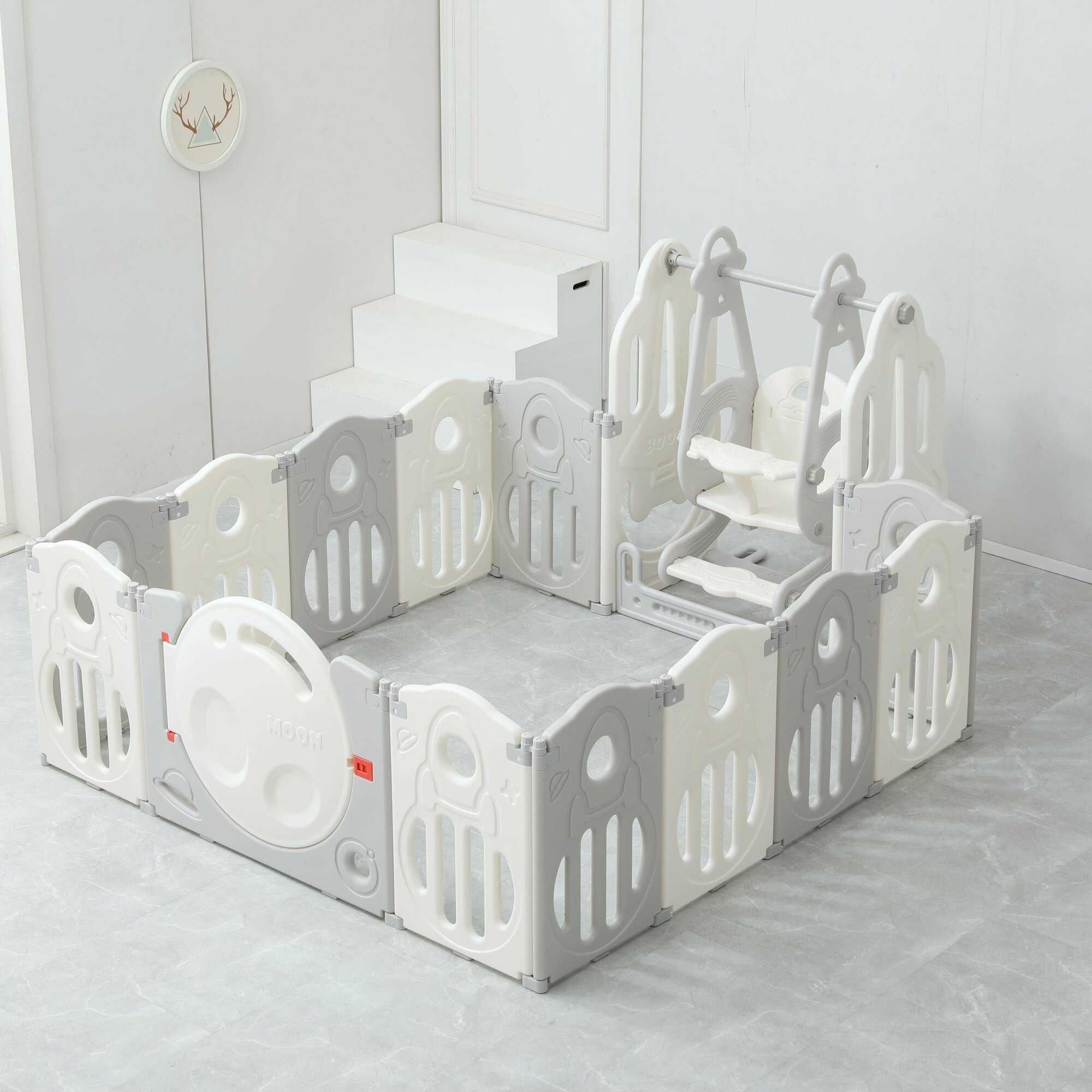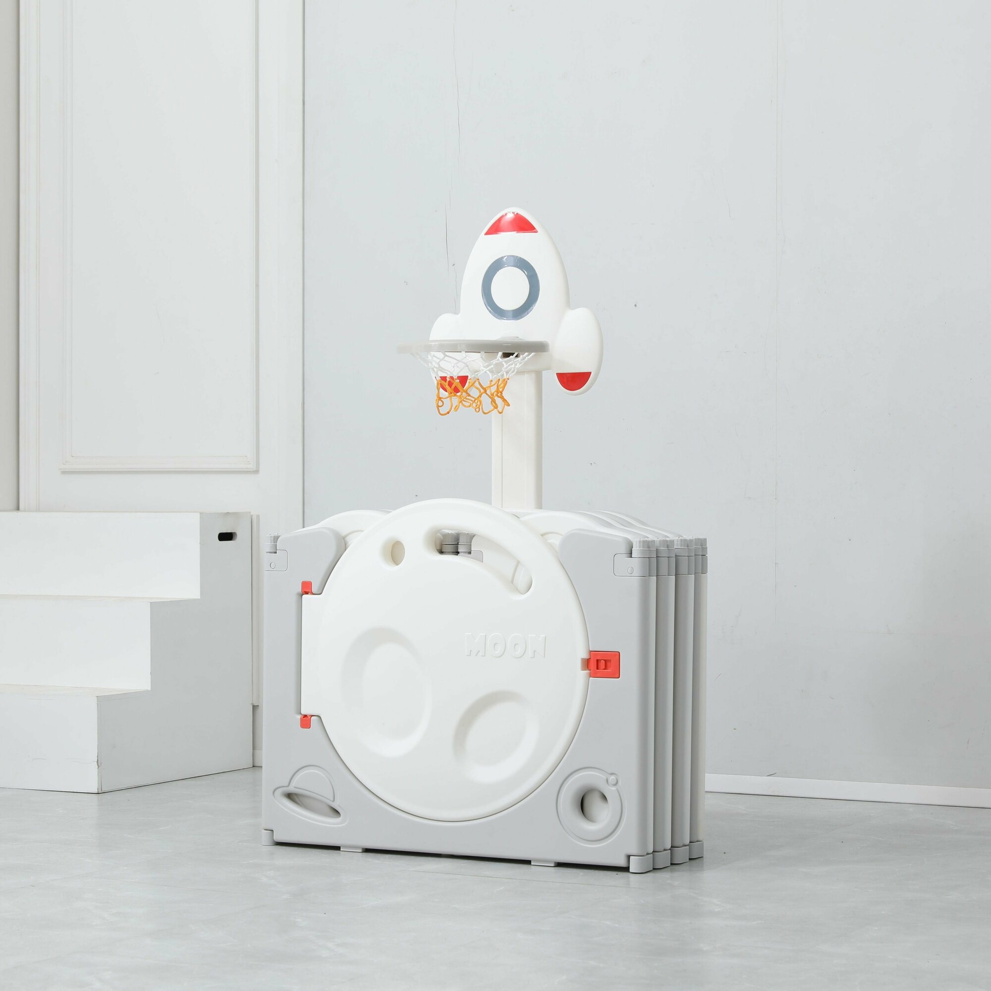 Купить Манеж UNIX Kids "SUPREME Space" Grey, серый, 200x240 см, с качелями, ковриком, горкой и баскетбольным кольцом для дома, улицы