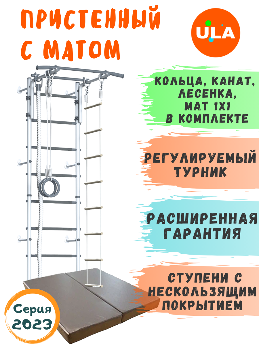 | Подробная комплектация | Комплектация: - шведская стенка с прорезиненными ступенями - турник: широкий и обычный хват - кольца гимнастические - канат х/б - лестница веревочная - мат гимнастический 1х1м складной |