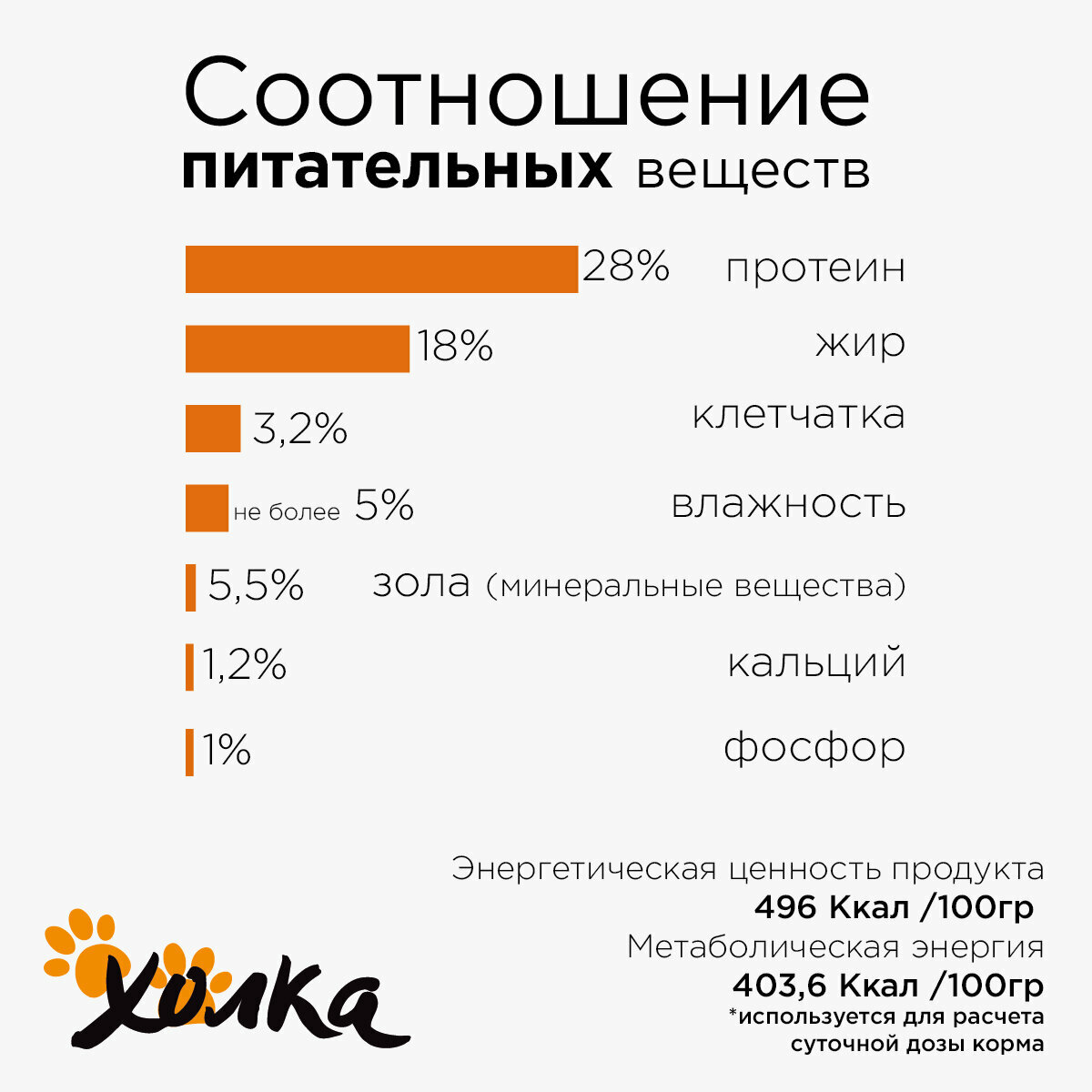 | Пищевая ценность | протеин – 28 %, жир – 18 % , в том числе омега 3 – 0,3 %, омега 6- 4%, клетчатка –3,2 %, влажность не более – 5 %, сырая зола (минеральные вещества) – 5,5 % |