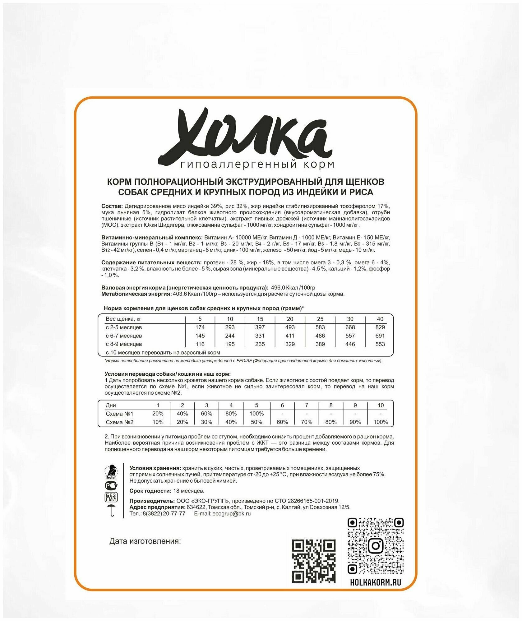 Корм холка гипоаллергенный премиум класса для щенков собак средних и крупных пород с индейкой и рисом, 750 гр.