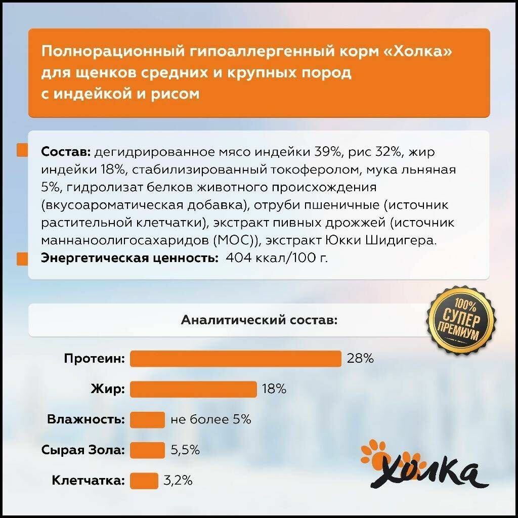 Холка гипоаллергенный сухой корм для щенков средних и крупных пород с индейкой и рисом - 7 кг